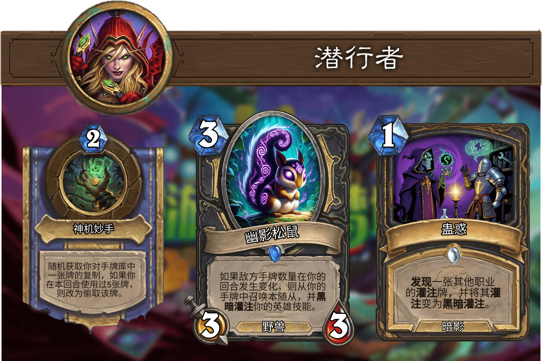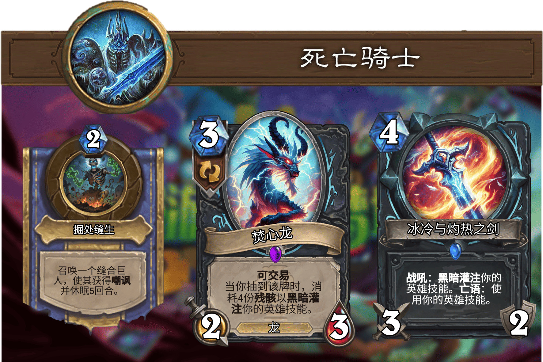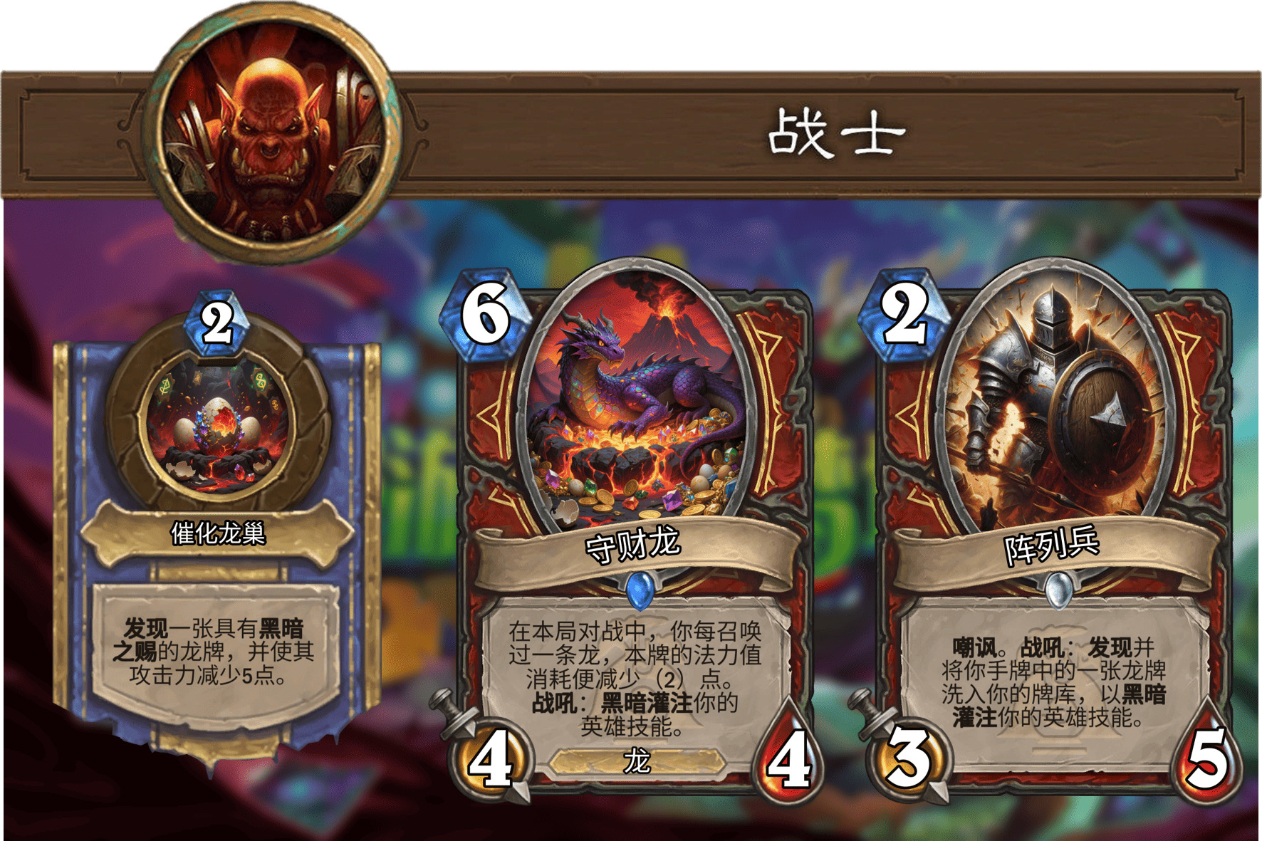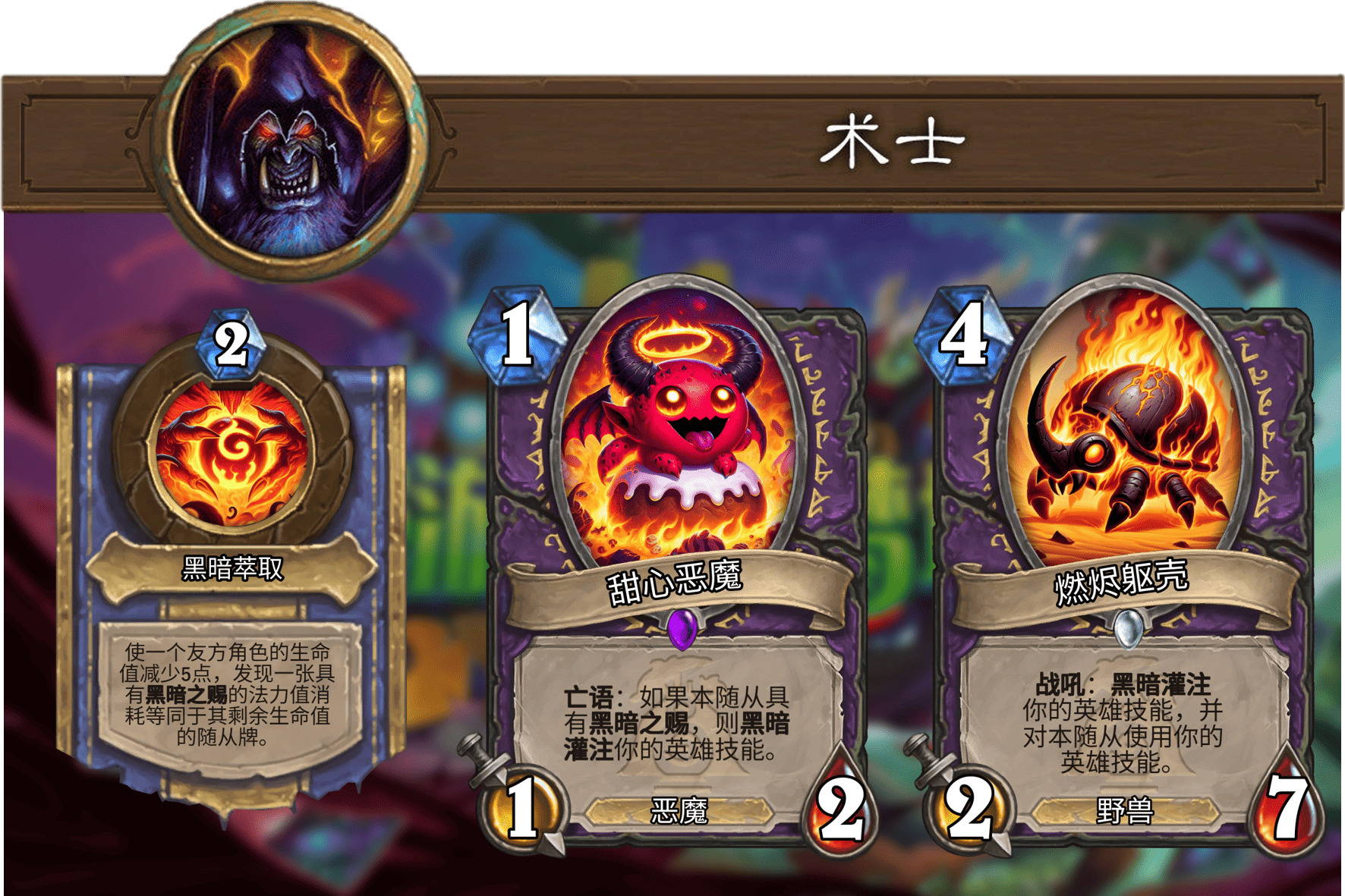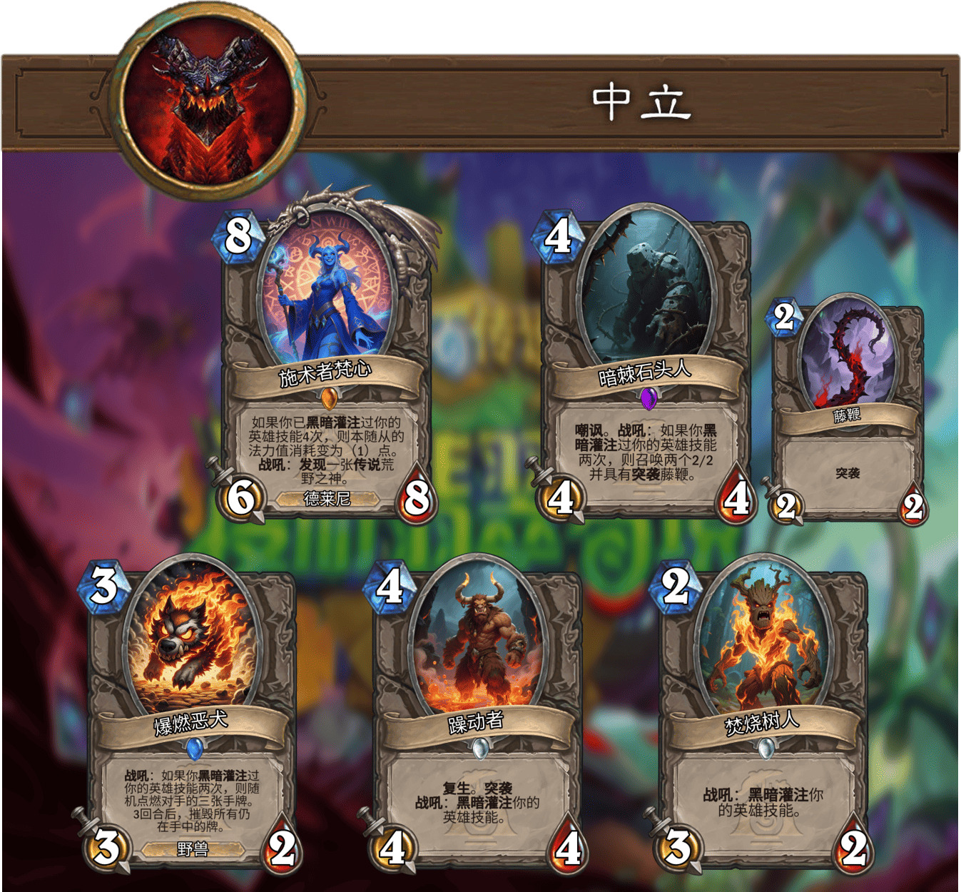 - 6次黑暗灌注后技能描述:选择一个友方角色,发现一张具有黑暗之赐的法力值消耗等同于其剩余生命值的随从牌。