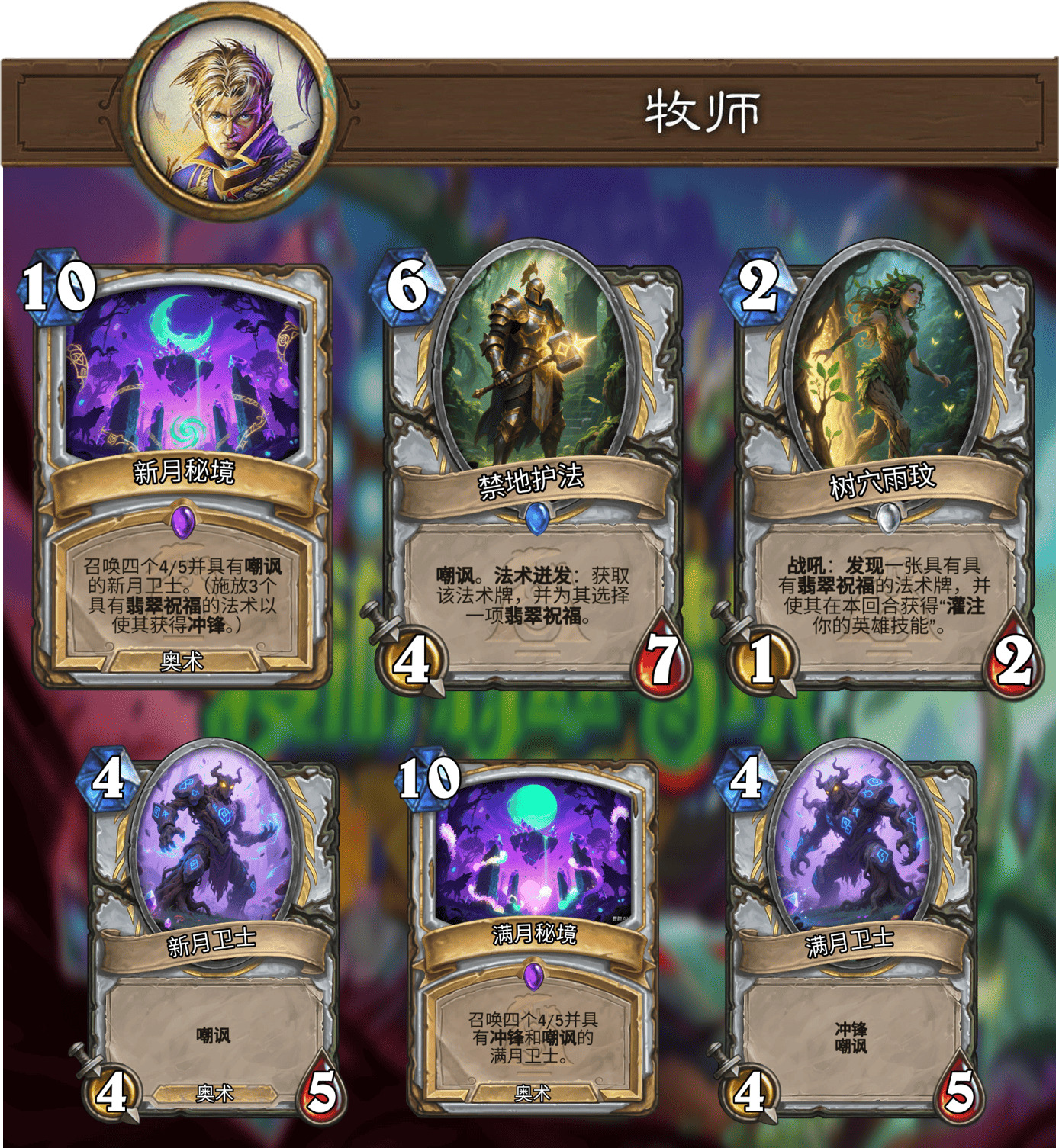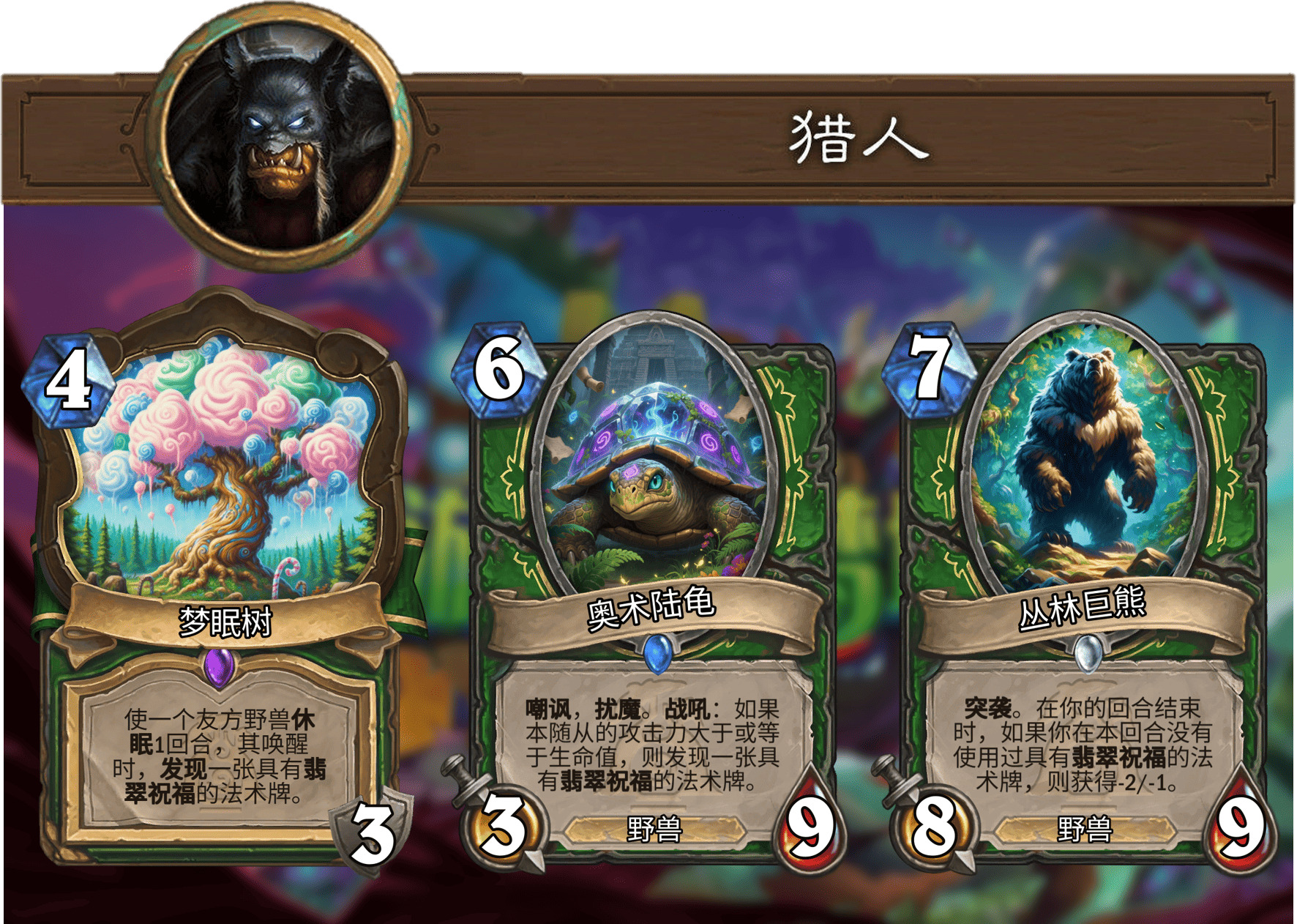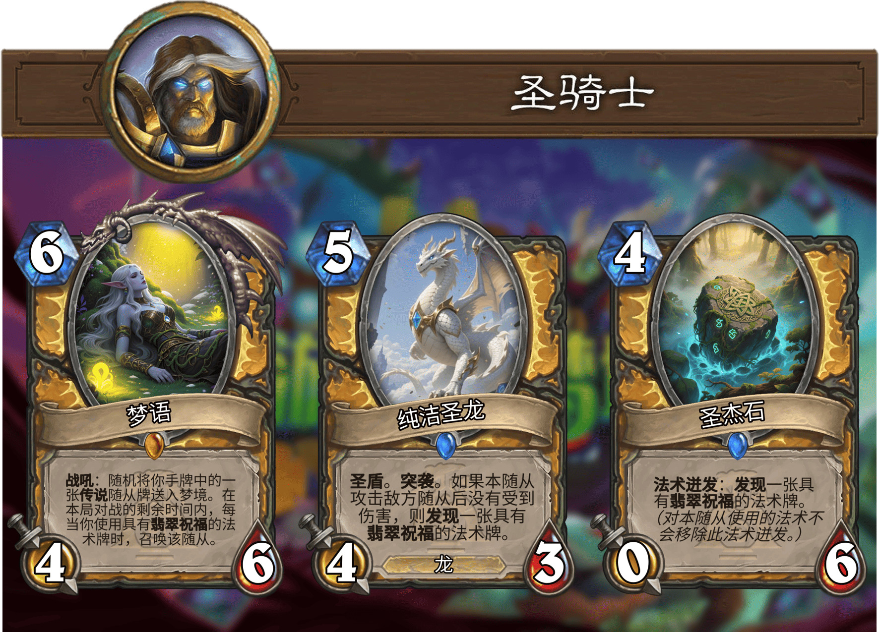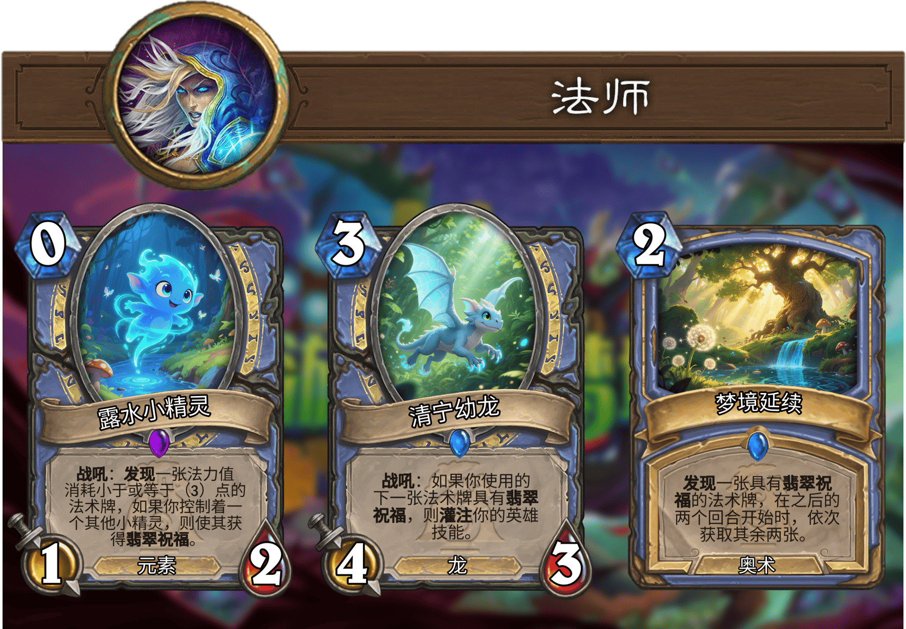 - 梦境延续与“获得发现的全部三张法术牌,但没有翡翠祝福。”的交互:发现并选择该祝福时,获取三张法术牌,后续两回合依次获得具有翡翠祝福的两张。发现但不选择该祝福时,后续两回合中的某一回合获取没有祝福的原本形态。