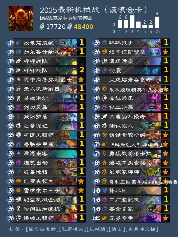 机械战听起来是比较远古的卡组,但是经过测试觉得现在还是可以一战的,下面我推荐一套机械战!①套牌:牛牛里面(无语的证人、鸡蛋、摧心者)②赢点:砰砰博士和补水区复活机械打伤害③思路:前中期主要靠机械和解牌过渡,提前下岩床复制假人和安全专家塞炸弹,中后期视情况下砰砰博士和补水复活机械打脸或鸡蛋抗疲劳④注意事项:①起始手牌一定要留解牌,不要贪容易前期崩②其他机械牌视情况修改,但是安全专家和奇利亚斯必须留③爆破工头可以提前下破坏对面牌库,高费机械够费直接下不要等化工泄露④有条件的可以带地雷,有什么建议欢迎评论区留言讨论!