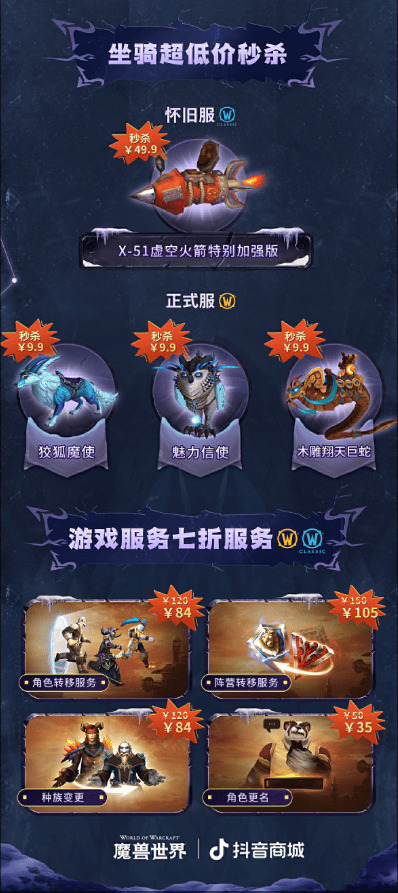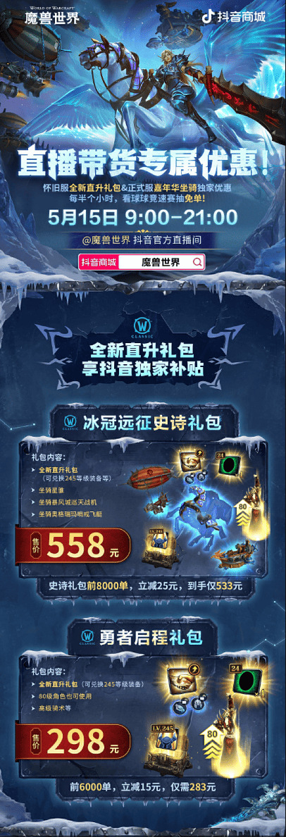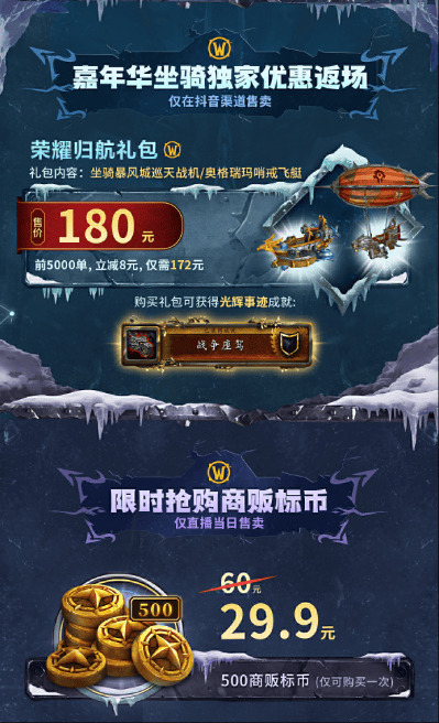 近日,魔兽世界国服运营团队发布了最新的商城活动预告,5月15日9:00-21:00前往魔兽世界抖音官方直播间,即可购买全新礼包与返场嘉年华坐骑:暴风城巡天战机/奥格瑞玛哨戎飞艇,单独坐骑售价180元。
