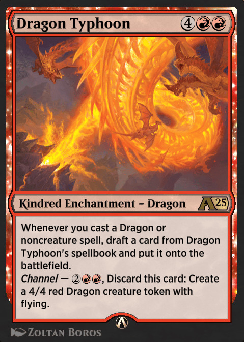 2.dragon typhoon:由于本身带龙可以被主将找所以就算生拍主将也能保证后续有场面,还能吃上古龙卫米瑞穆 的效果一下出两,配合峰顶惧龙只要对面脸上没辟邪基本是稳定斩杀的,对面有辟邪就找跨金桥巨龙(有能套敏捷的直接铺场踢死),龙台风的法术书里面有雷鳞,加上主将找的雷鳞刷一轮风暴数还是能用战阶一脚带走的,此外魂力扔了出个44飞机也能在对阵某些去除能力较弱、台风无法结算的情况(打蓝批的时候)给一定的压力
