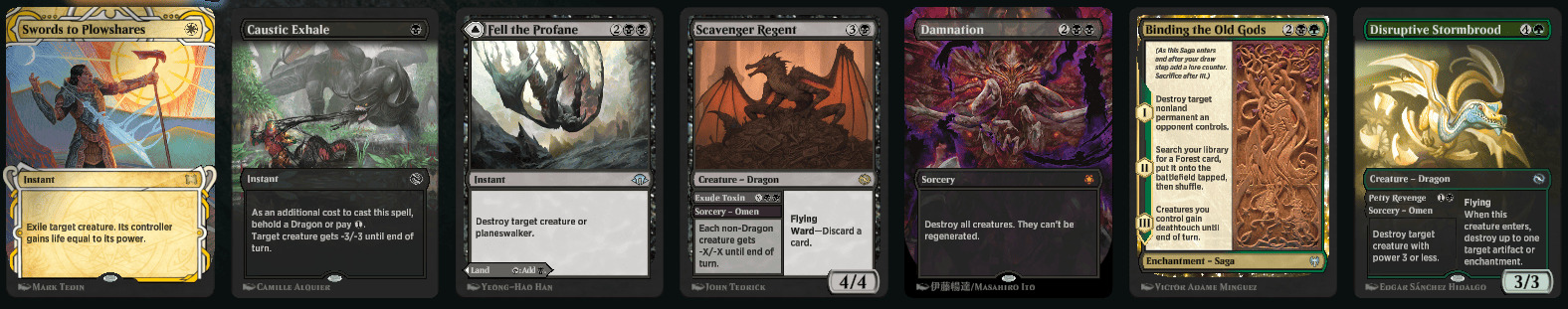 去除:由于带了大量跳费组件,剩余卡位还是比较挤的,所以笔者的构筑并没有带很多去除,而且由于主牌带了较多沾黑的牌(特别是贮宝族领3B导致需要更多的黑地)因此扫场只带了破灭和食腐龙侯,