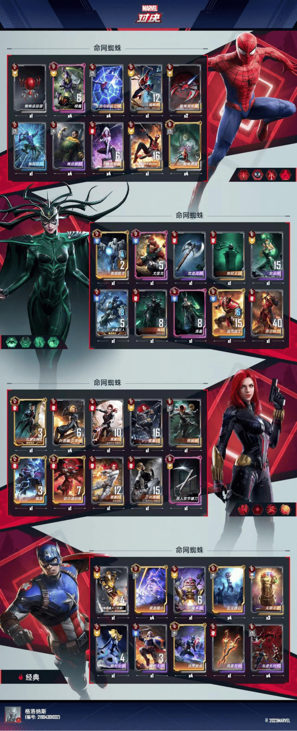 (3)买下的【命运与命运之网】不用着急使用,以免污染卡池,等快凑齐了再多张打出。命网发现的蜘蛛单位优先选择蜘蛛侠2099、白色共生体、黑色共生体。白色共生体贴给【异界绿魔】,黑色共生体贴给【异界绿魔】外的单位;