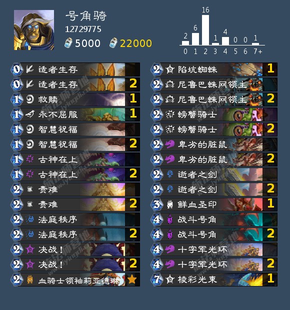 狂野4-传说分段,号角骑10连胜上传说,1场未输(5级未特意降分)留牌手法∶起手优先级2费排序>>号角>2费奥秘刀>1费奥秘,2费法术加五不要随便用,以及2费随从战吼加2不要卖(很重要),未碰到过劣势对局卡组供参考如下### 号角骑# 职业:圣骑士# 模式:狂野模式## 2x (0) 适者生存# 2x (1) 古神在上# 1x (1) 救赎# 2x (1) 智慧祝福# 1x (1) 永不屈服# 2x (2) 决战!# 2x (2) 卑劣的脏鼠# 2x (2) 尼鲁巴蛛网领主# 2x (2) 法庭秩序# 2x (2) 螃蟹骑士# 1x (2) 血骑士领袖莉亚德琳# 2x (2) 责难# 2x (2) 逝者之剑# 1x (2) 陷坑蜘蛛# 1x (3) 鲜血圣印# 2x (4) 十字军光环# 2x (4) 战斗号角# 1x (7) 棱彩光束# AAEBAb7jAwaMAY6aA4OWBYSWBa6DBpmOBgzdCogO2McC+NICnewCg94DkeQDzusDwOIElfUF9ZUG0Z4GAAA=# # 想要使用这副套牌,请先复制到剪贴板,然后在游戏中点击“新套牌”进行粘贴。