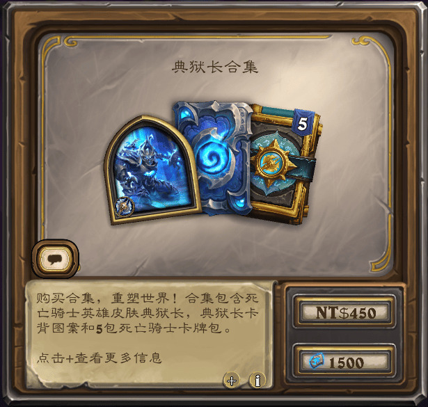 含构筑模式死骑新皮肤“监狱长”及其配套卡背,和死骑5包,售价980奥术宝珠(国服)/1500符文石(外服)。