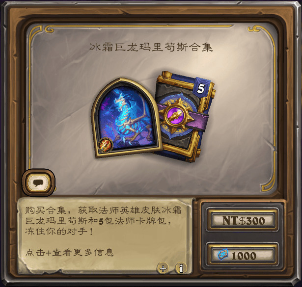 含构筑模式法师新皮肤“冰霜巨龙玛里苟斯”和5法师包,售价600奥术宝珠(国服)/1000符文石(外服)。
