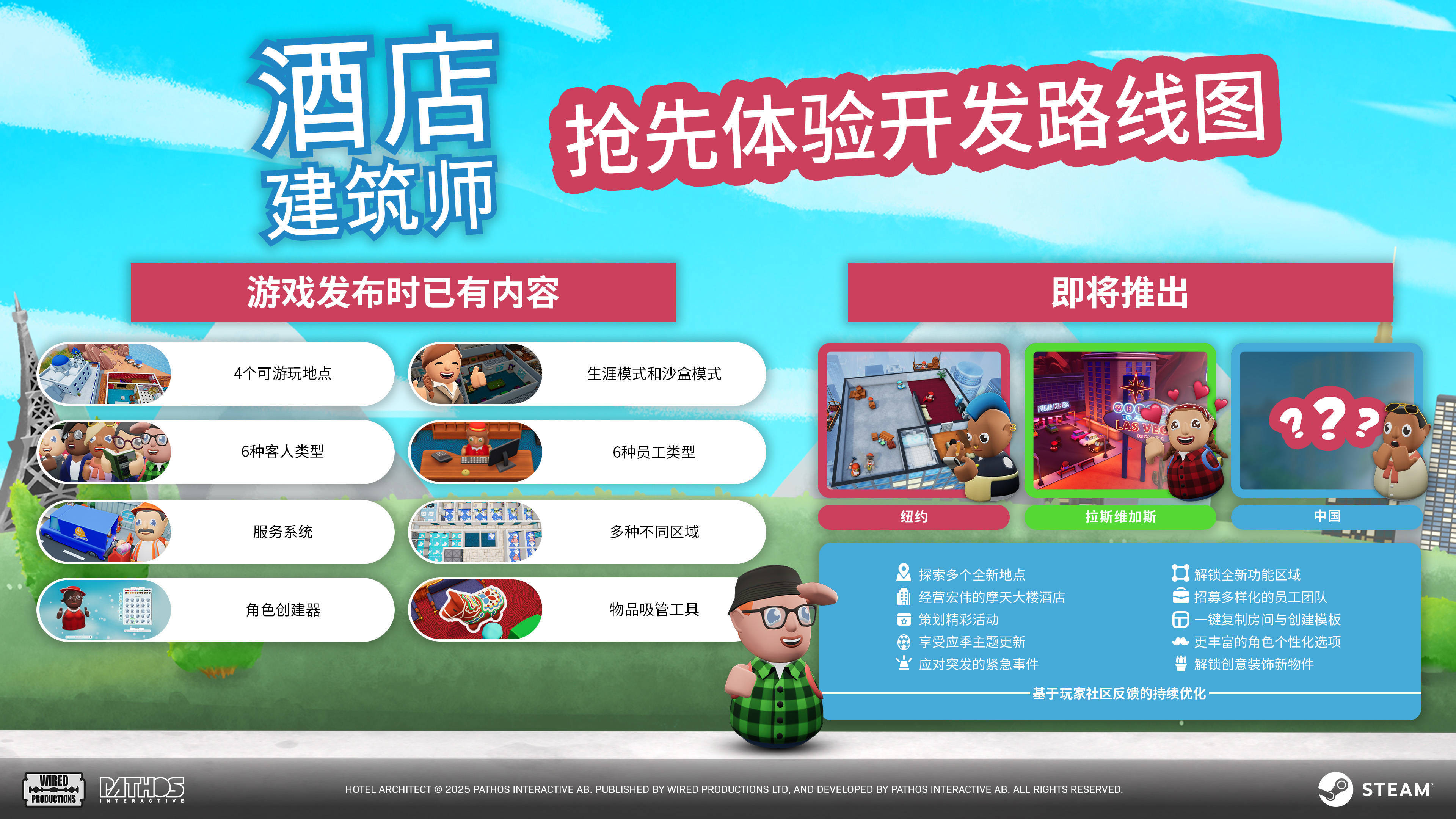 游戏发布前取得了玩家社区的热情和喜爱,《酒店建筑师》开展了游戏测试和试玩,并在Steam新品节期间进入了最热模拟游戏排行,Pathos Interactive和Wired Productions非常高兴能够根据持续给予支持玩家社区的反馈,继续努力打造五星级体验。