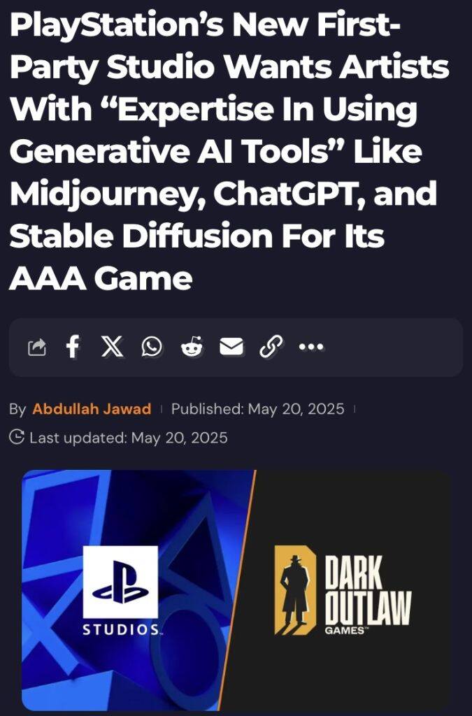 Dark Outlaw Games是一家新成立的PlayStation工作室,脱胎于Deviation Games,由《使命召唤:黑色行动》僵尸模式主创杰森·布伦德尔(Jason Blundell)领军。这家开发商正在为他们首个3A游戏招聘一名概念艺美工,但很有意思的是,这个职位要求熟练使用生成式AI工具,比如Midjourney,ChatGPT,Stable Diffusion。这似乎是PlayStation第一方工作室首次如此直接地推动生成性AI体验。