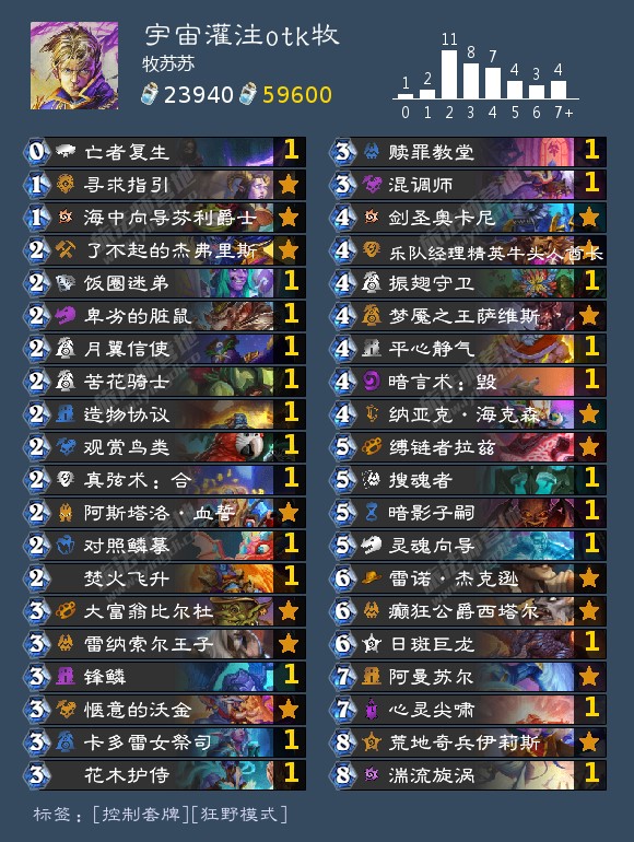 构筑思路1.灌注与英雄牌排斥,因此不带神雷诺和DK干扰灌注技能,用8费冲水替代雷诺解场和弥补曲线,用大富翁子嗣拉兹otk替代8费DK这个不稳定终端2.灌注与脏牌排斥,脏牧带大主教,通过2费打2站场面,又有脏牌带来资源,也可和收割者配合破坏手牌。这套牌通过灌注获取资源和乐趣,破坏手牌通过其他单卡替代3.灌注与任务相性佳,作为otk,灌注,拉兹,子嗣,大富翁4卡上手率很重要,而任务前两阶段相当于发现术,再加上一些如观赏鸟类,造物协议,萨维斯之类的随从检索以便更快打出otk,做任务,或者找灌注牌针对牌4.关于润滑曲线,血誓一卡可做2,5,8三次任务,必带,8费曲线伊莉丝是我的一个想法,因为子嗣和大富翁不需要战吼,有概率被拉出牌库直接达成otk 5.关于灌注卡,都带不用特意检索,每回合摇技能收益更大,还有迷你包323过牌7.只带了两条龙,锋鳞针对otk,666快枪龙可交易润滑曲线,用对照鳞摹抽二很赚,不带绿龙,用不上它的费用提升8.真弦术合可回手关键牌如泰坦,或者灌注牌,实际用下来很不错