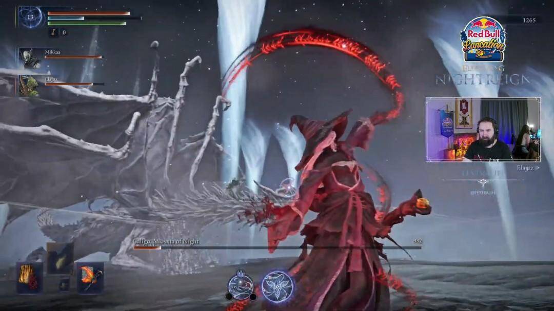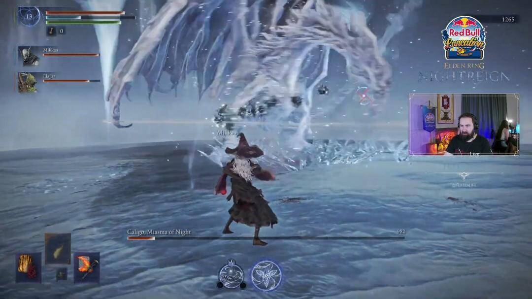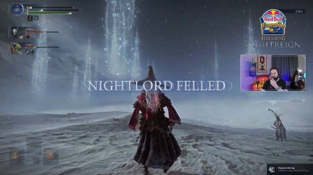 此次情报源自红牛“兰卡斯特”活动,直播中九位内容创作者被分为三支队伍,共同挑战《艾尔登法环:黑夜君临》的最新Boss“查理戈”。这只冰霜巨兽藏身于名为“雾之裂隙”的新地牢深处,其全称为“夜之瘴气·查理戈”。