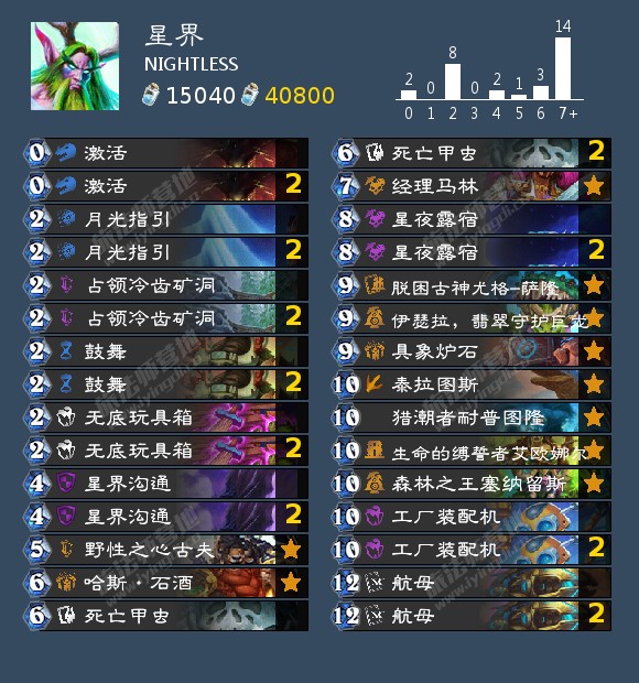 思路:四张发现,四张跳费,两张定向抽高低费,两张星界,三张灵活卡位(星夜露宿/泰坦)一张英雄一条工具龙伊瑟拉,14张质量随从。