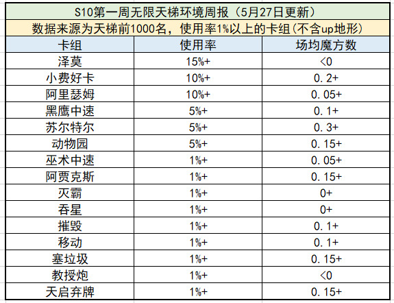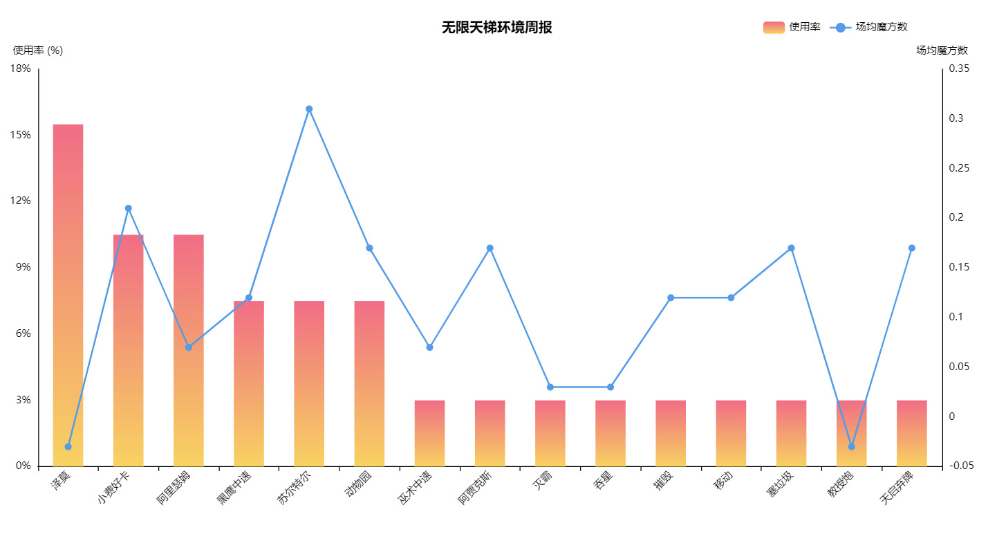 第一周数据来源无限天梯前1000名,巨狼和痛苦增强了泽莫卡组,带来了最高的热度。被忽略的苏尔特尔偷偷上大分,动物园和阿贾的表现依然很稳健。