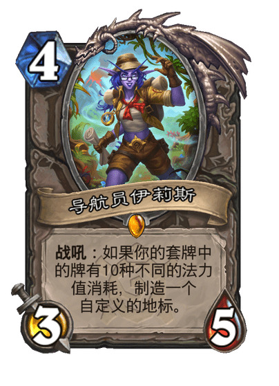 战吼:如果你的套牌中的牌有10种不同的法力值消耗,制造一个自定义的地标。