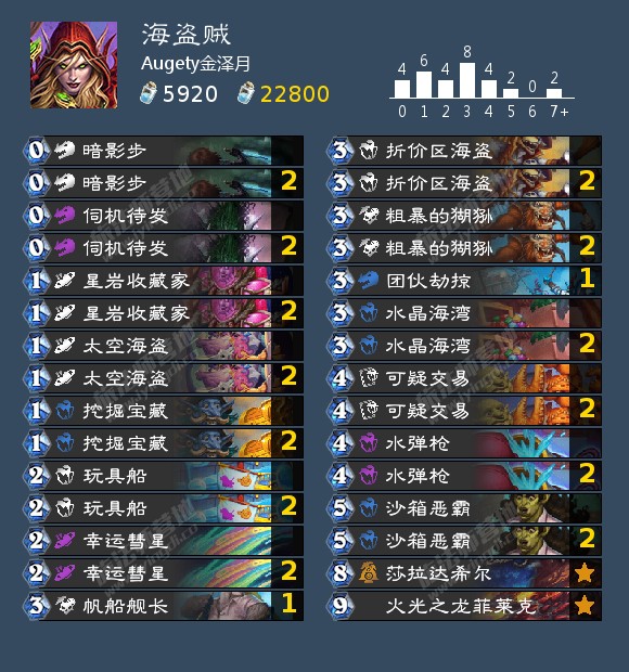 个人微调,去掉了背刺带上了俩121海盗,更好配合海盗船,低费用也能配合打连击,给刀减费也能做到 1费121,硬币地标,3费挂刀点地标,打法师,dk时非常好用。可调整卡位,121海盗可换背刺,换奇利亚斯。