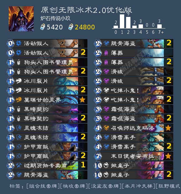 卡组为原创,所以有问题直接问本人就行,相较于第一版,替换了船运配合灾祸降临,同时打了很久发现大部分情况也不需要船运配合火焰灾祸,并且卡组本身过牌就特别快(不然没必要带4个0费随从)所以舍弃这多余的配合带了两个10费aoe,同时也携带了几张恢复卡,在不卡手不影响启动回合和速度的情况下加了抗快能力。