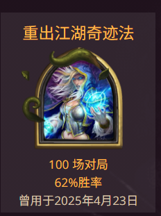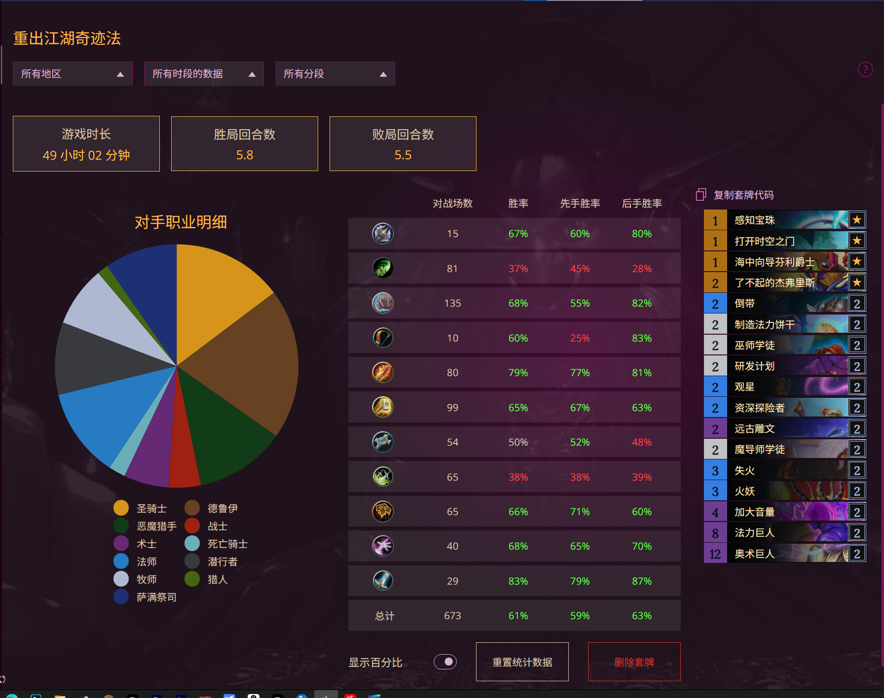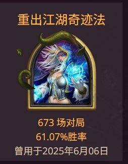 好在这样的环境在近一次的狂野补丁中有所改变,肥婆的削弱让暗牧的热度有所下降,笔者在五月份则潜心研究这套奇迹法的玩法与思路,最终在这个月新赛季后,笔者使用这套奇迹法,耗时六天,将六个号打上了传说,经历了近670场的卡组对局,积累了大量的实战经验,最终卡组战绩如下