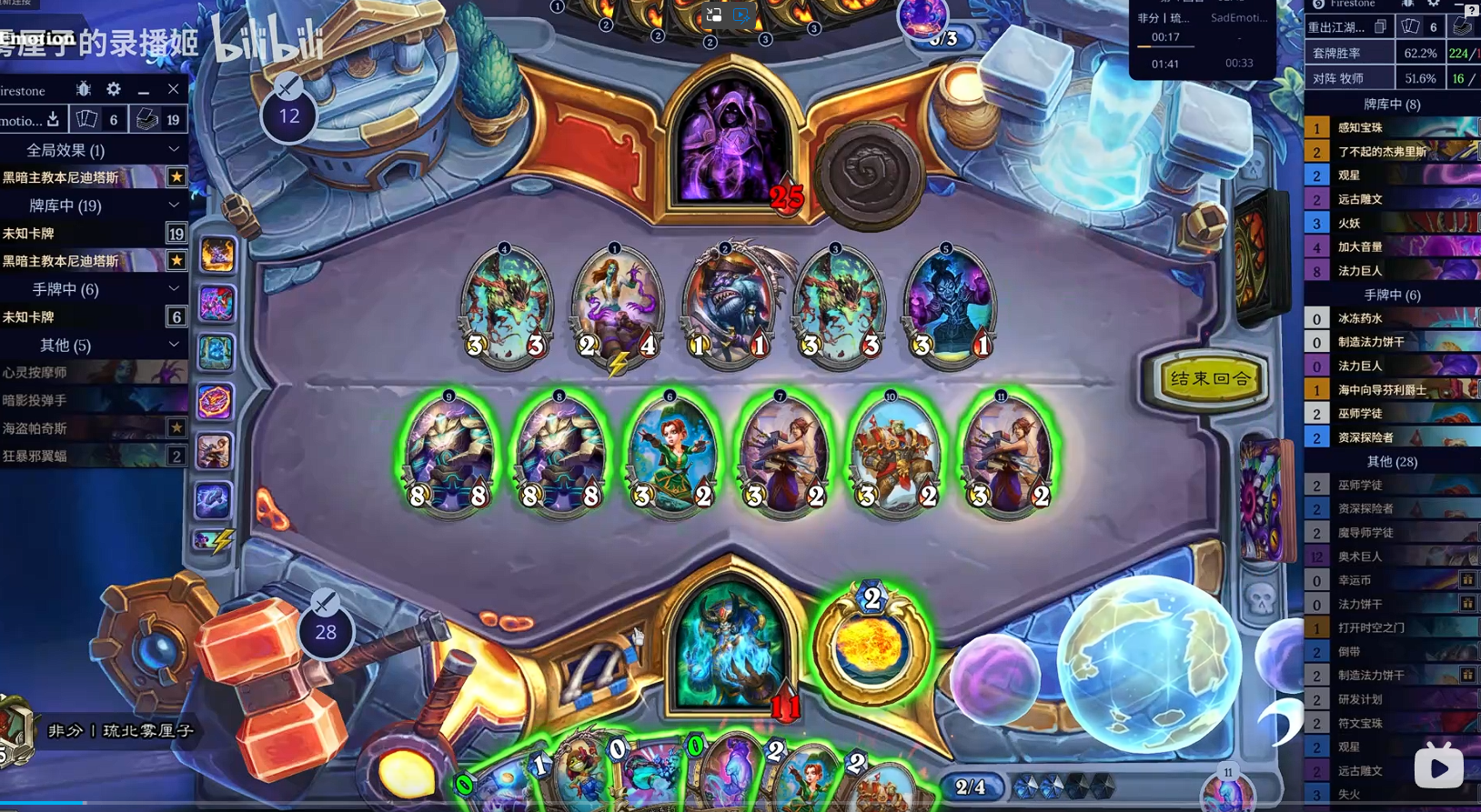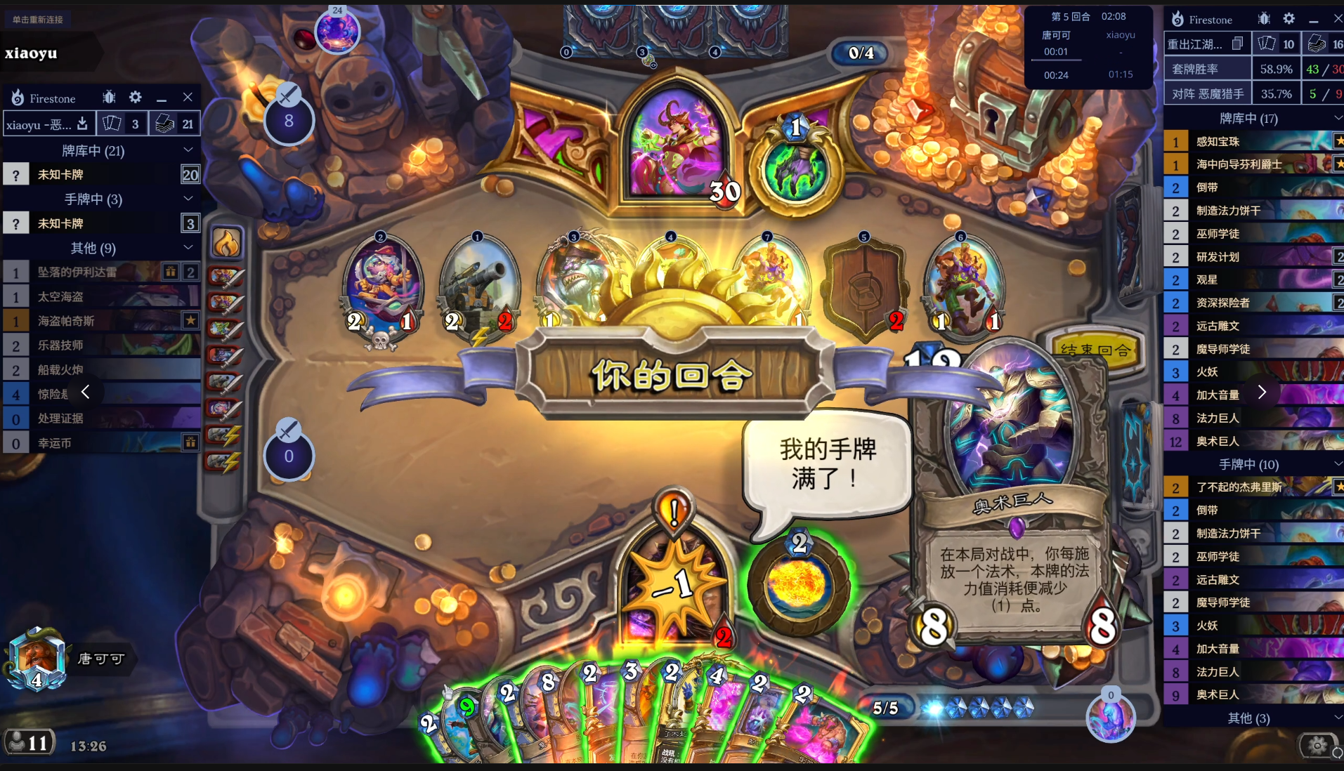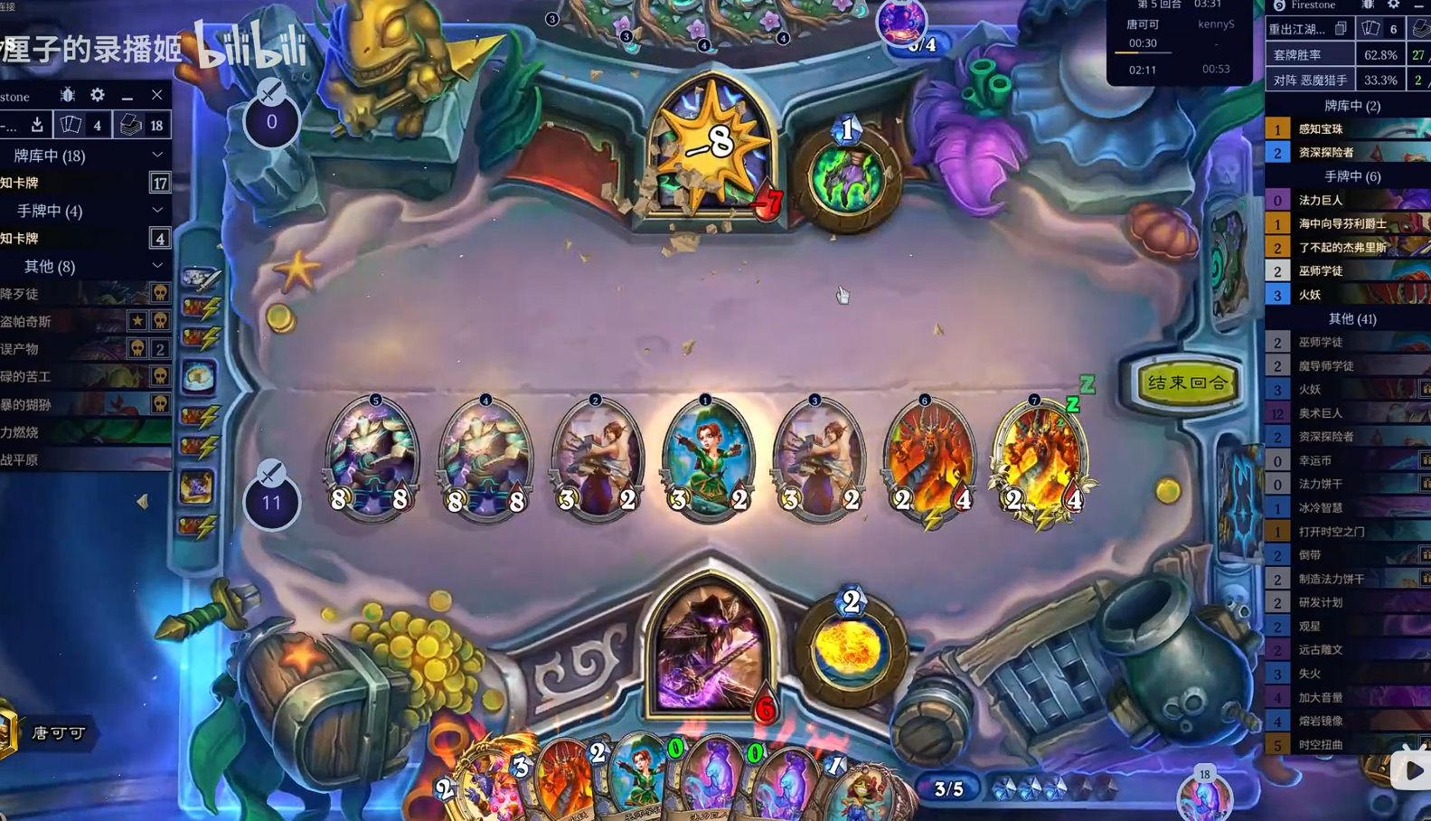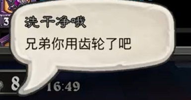 环境中大劣势对局为海盗瞎,由于卡组性质,我们前3费几乎属于空过,并且瞎子手中还有法力燃烧以及滑翔这两张极为克制我们的卡,任务瞎可能是小劣势对局,虽然压力没那么大,但是关键回合锁费或者滑翔我们还能无能为力,没办法,洗洗脸下一把,或者你也可以像下面一样,相信天胡斩杀。
