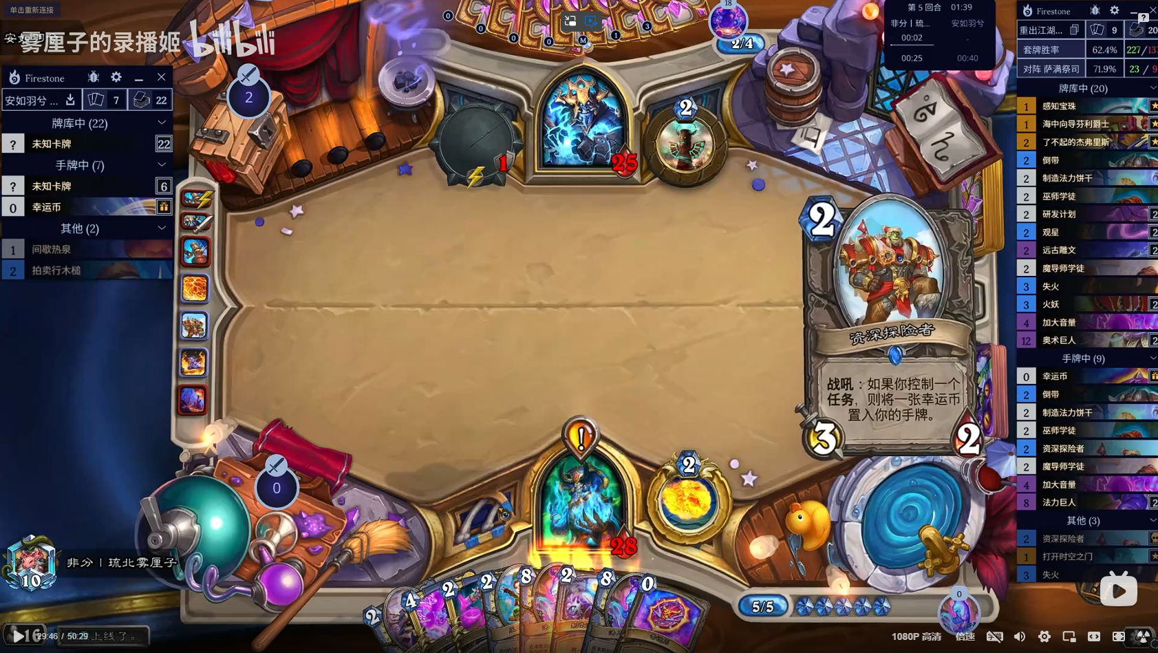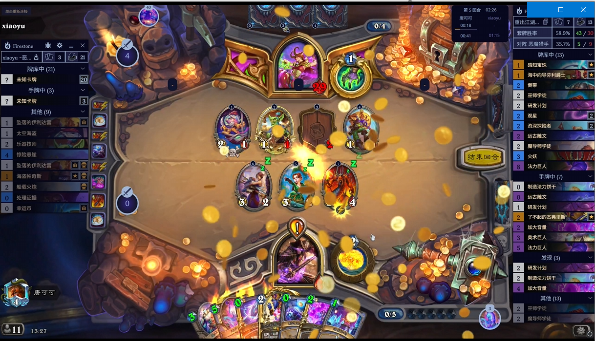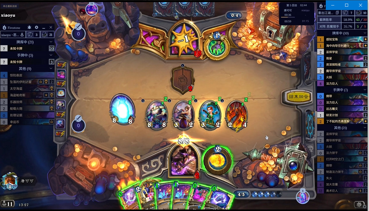 环境中大劣势对局为海盗瞎,由于卡组性质,我们前3费几乎属于空过,并且瞎子手中还有法力燃烧以及滑翔这两张极为克制我们的卡,任务瞎可能是小劣势对局,虽然压力没那么大,但是关键回合锁费或者滑翔我们还能无能为力,没办法,洗洗脸下一把,或者你也可以像下面一样,相信天胡斩杀。
