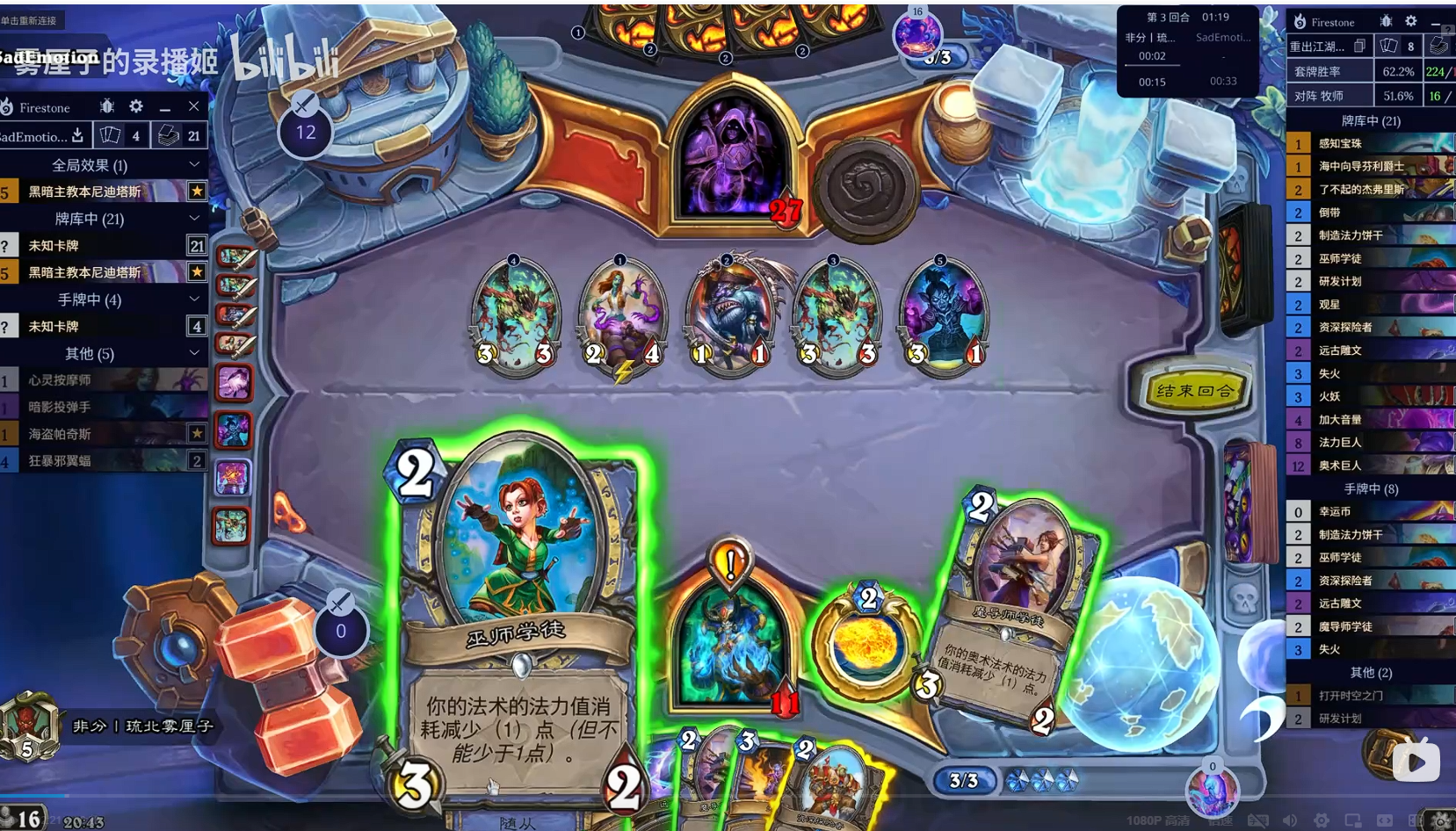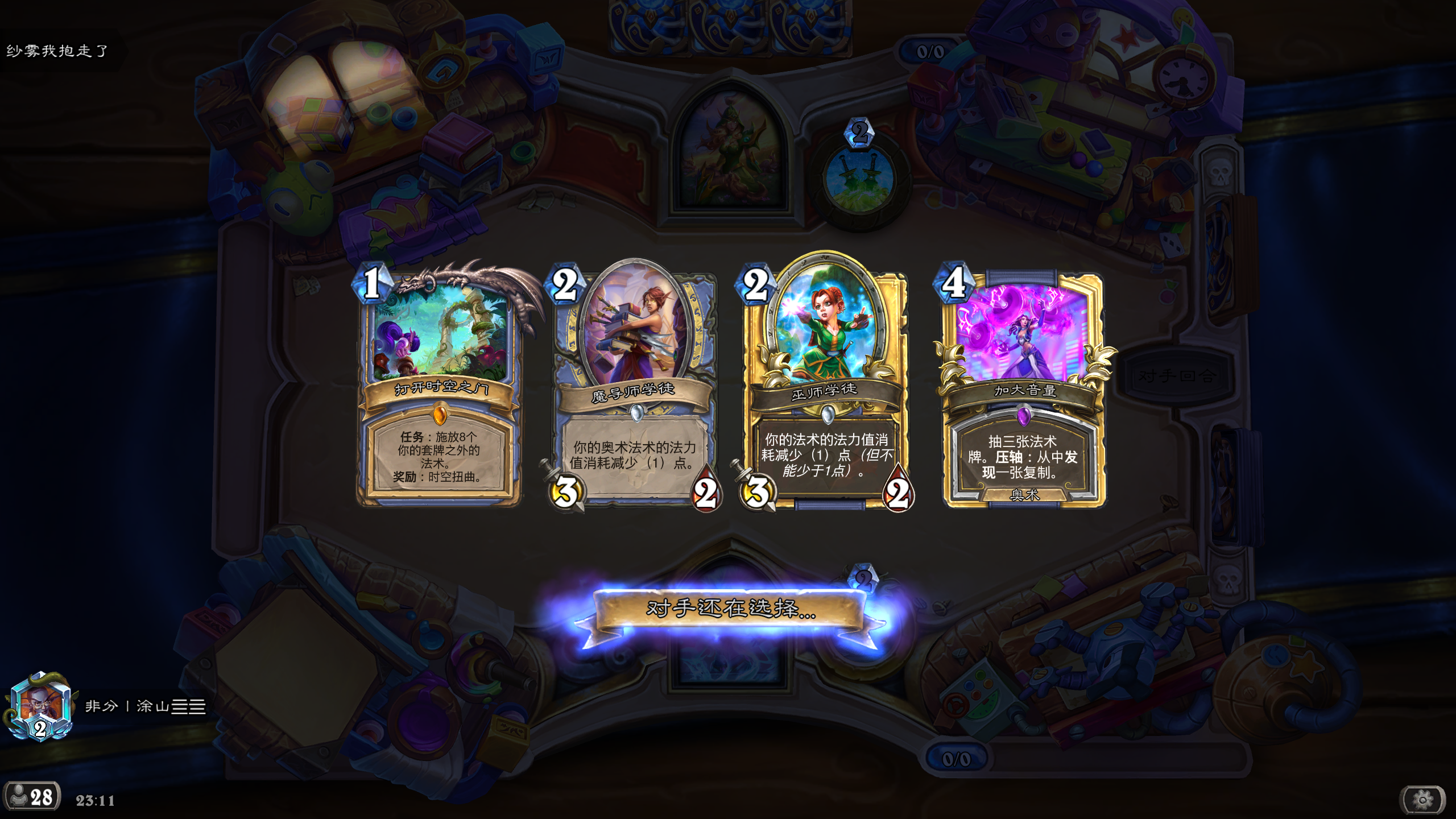 法力虹吸:得益于巫师学徒的逆天光环减费机制,如果双学徒后触发虹吸减费,那么恭喜你,原本0费用的奥术法术会莫名其妙又变成了1点费用,而且这张牌还影响观星检索,放弃