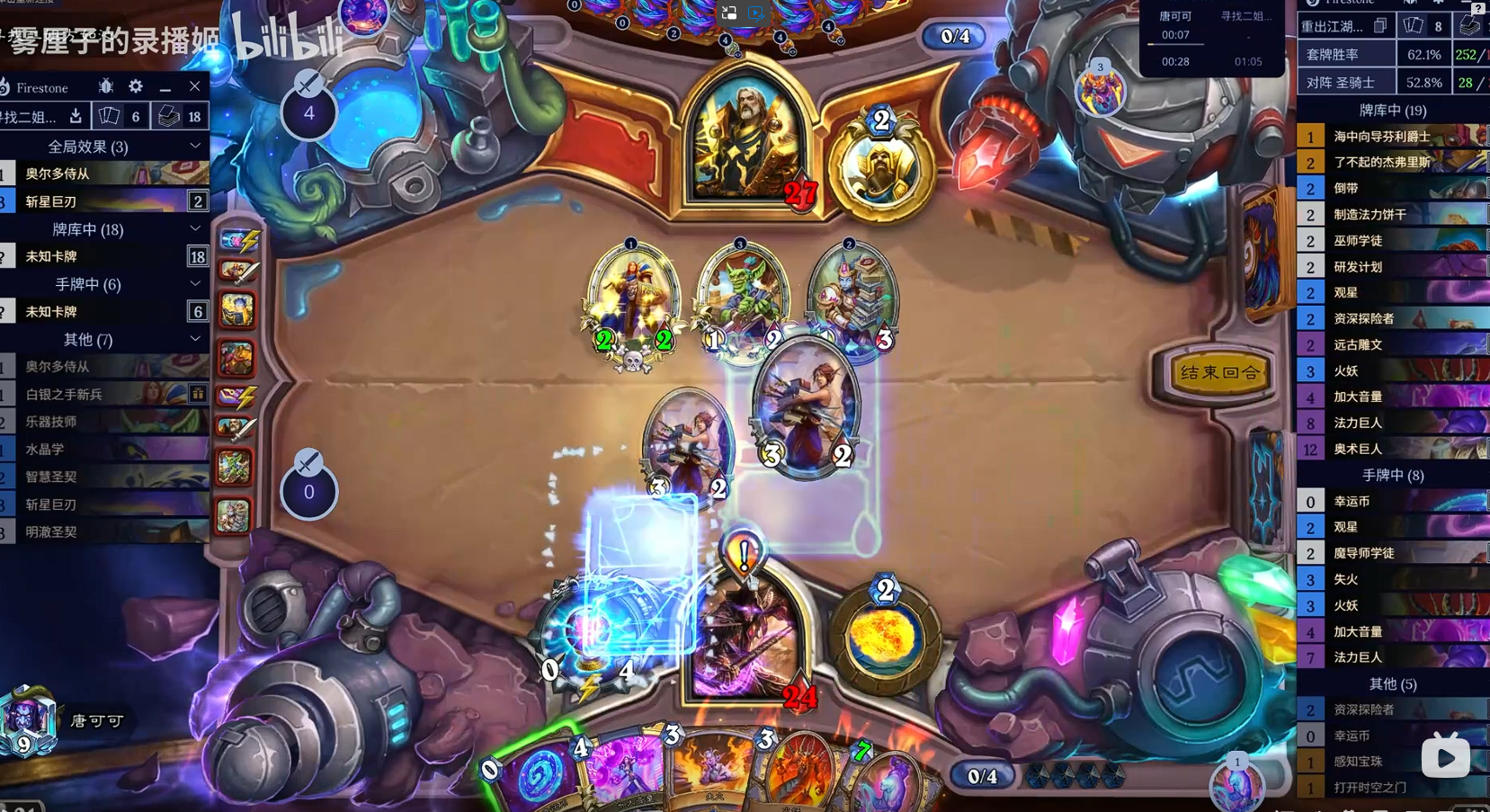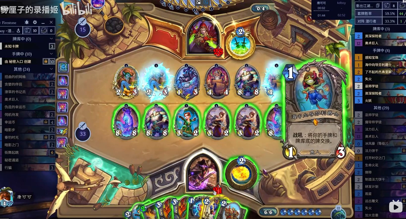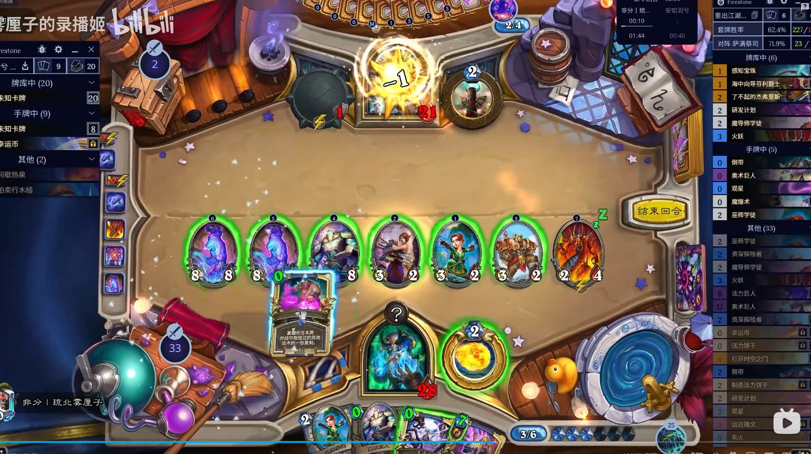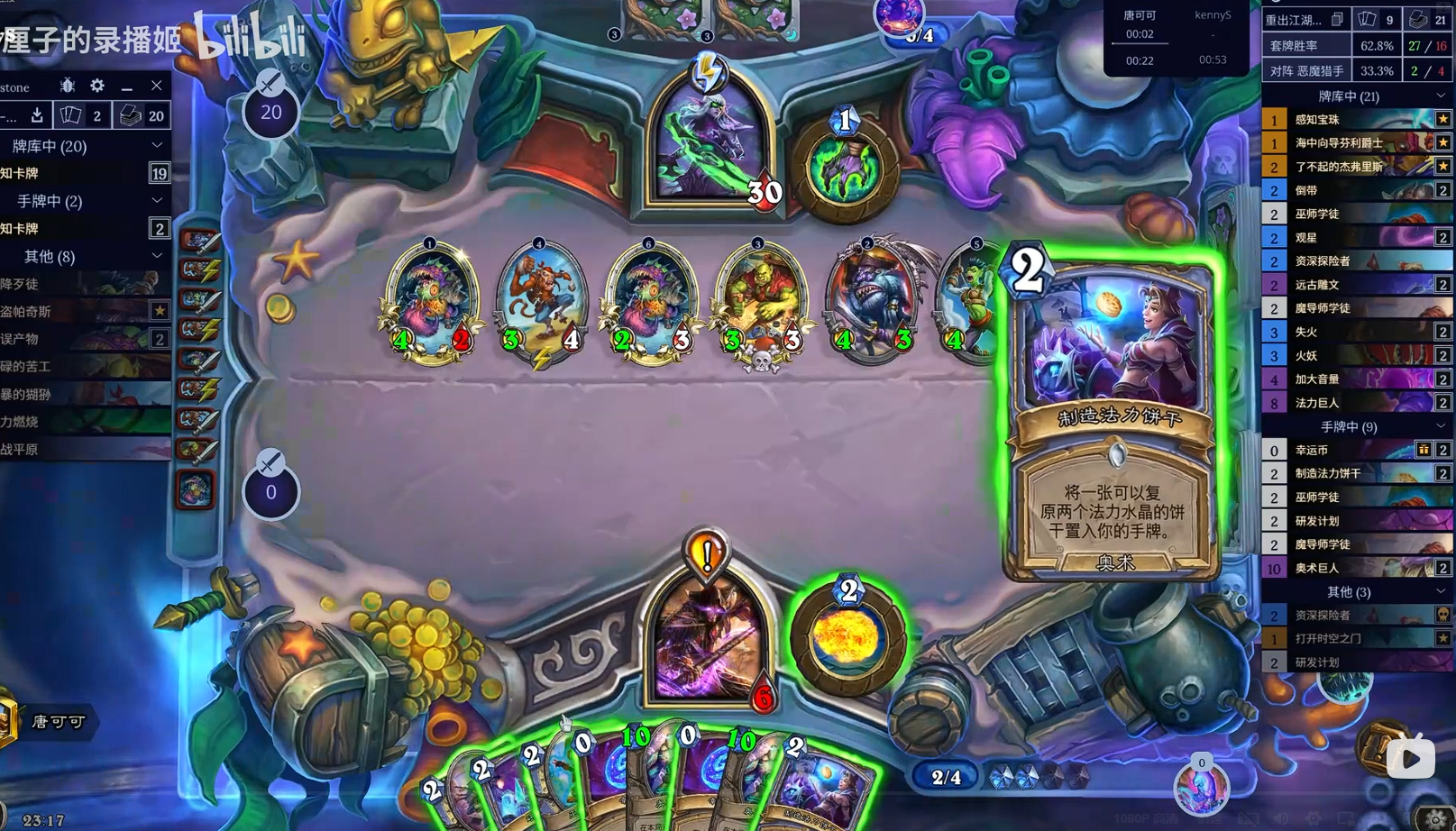 海中向导海芬利爵士:卡组另一个奇迹核心点,常常用在手牌无key牌的情况下打出,实现将牌库key牌一回合抽到手的效果,芬利在某种意义上是另一个0.5个学徒,常常发力在5费回合,打出巫师学徒后,利用芬利去将牌库内的奥术学徒抽到手,此时打出奥术学徒,手牌中可以依靠0费的奥术法术,如观星 倒带 饼干 实现回复费用,再打出与之关联的加大音量,开始饼倒饼,观倒观,加大压饼干的电表倒转效果,也用于双学徒开门后芬利去寻找天启四巨人,在某些情况下也可以用于换牌寻找姐夫,不过需要注意的是手牌最好不要有重复的牌,否则换上来的姐夫是无法触发宇宙的,在有加大音量的情况下,由于4费或者3费的加大音量将所有法术牌全抽上来了,则牌库低大概率均为随从牌,这为我们检索双学徒提供了有利的机会,而加大抽上来的法术牌又可以置于牌库底,实现再次被观星或者加大检索的可能性,可以说芬利也实现了类似宝珠的效果,为下回合启动提供了更高的可能性。