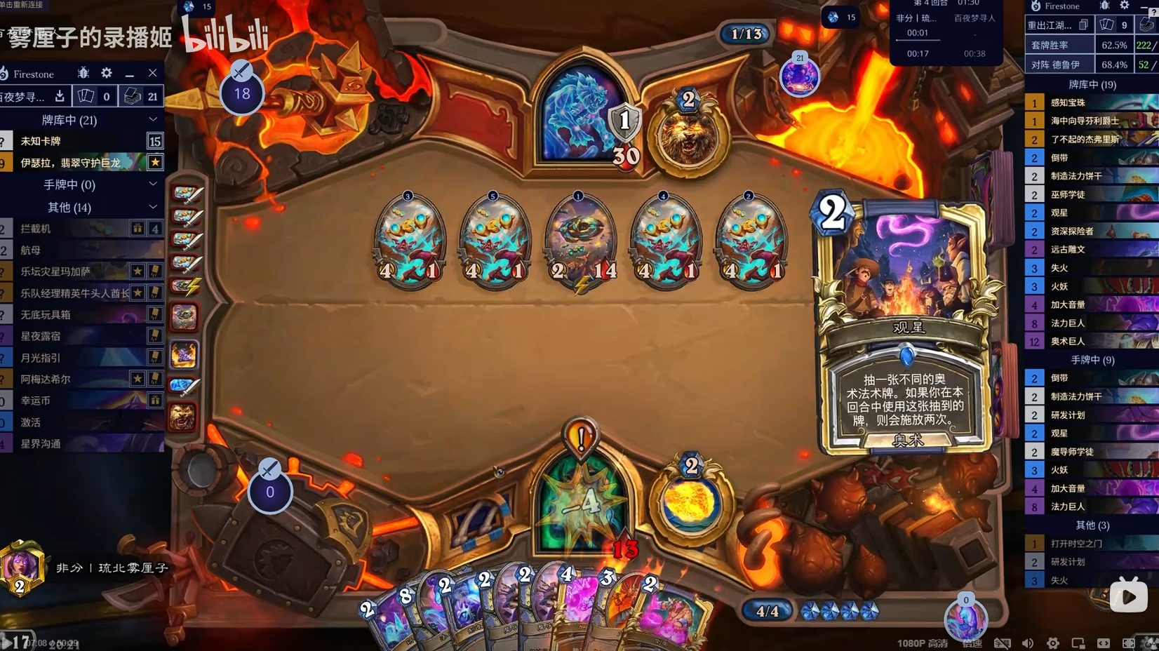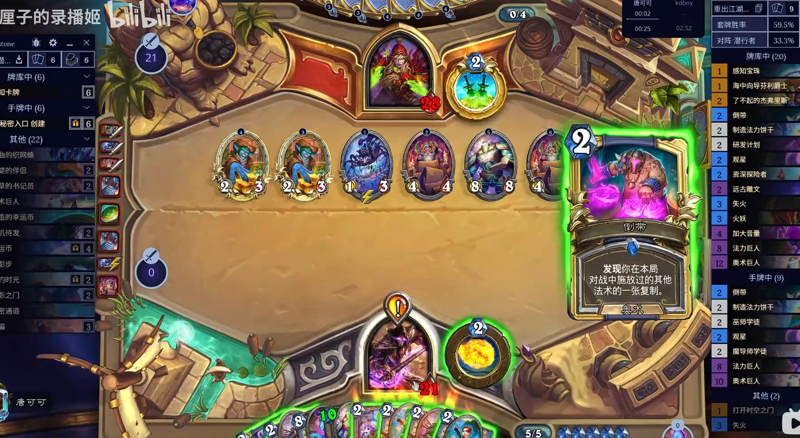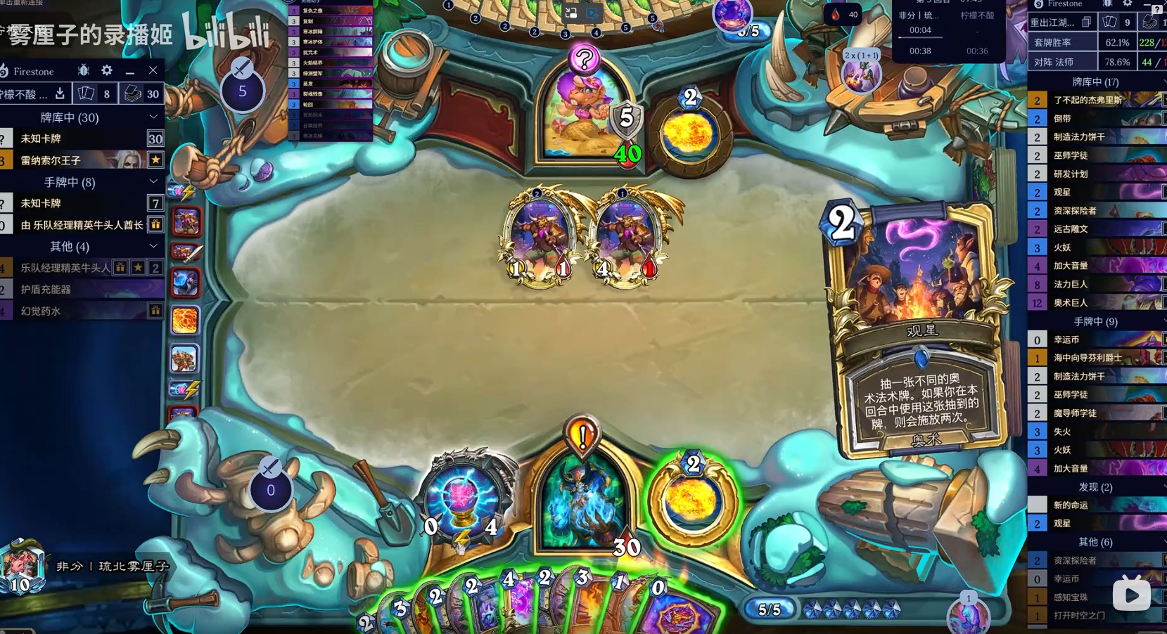 观星抽倒带实现两次观星,由于牌库奥术法术只有加大饼干倒带,而观星是无法检索自己的,所以基本大概率稳定实现观星抽倒带或者饼干,如果是加大,则可能会卡手,可惜一点则是雕文也是奥术法术,如果抽取雕文则会较为卡手,不过即便如此,在双观星的检索下,只要稳定检索第二个倒带,实现三次观星,大概率可以稳定检索到饼干实现电表倒转的效果,甚至可以依靠额外饼干搭配观星后的加大音量直接补充8张法术牌,观星可以说是卡组另一个奇迹电表驱动器,因为单次倒带回复的费用只有两点,而经过观星加持的饼干和倒带可以达到恐怖的4点费用,为后续火妖上场,或者法术抽牌检索巨人提供了强有力的保障。
