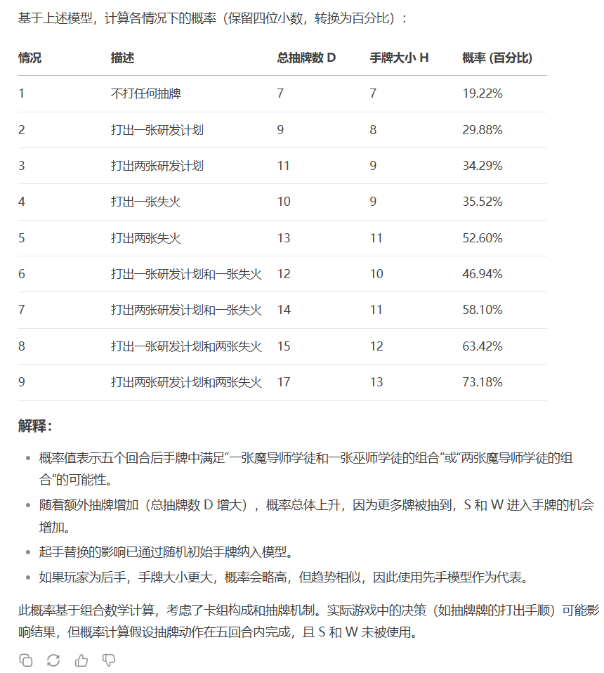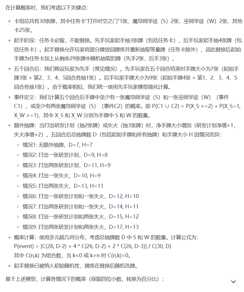 笔者在近650场的实战中,体感并没有觉得双学徒很难上手,很多情况下依靠留牌以及宝珠,搭配芬利是很容易实现双学徒的combo的,当然,体感是一种玄学,于是我设计了这样一套问题丢给deepseek,当然,这里是少了一张芬利,以及没有考虑感知宝珠的过滤牌库。实际概率可能还会稍微高一些。
