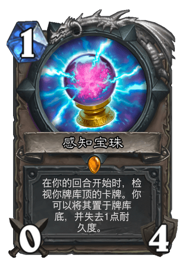 感知宝珠:起手必留,并且一费回合必挂,即便是先手有探险者,也建议优先挂,早一回合挂,早一回合神抽,后手可以任务硬币挂刀(手中有探险者的情况下)如果没有探险者优先挂到,2费挂任务
