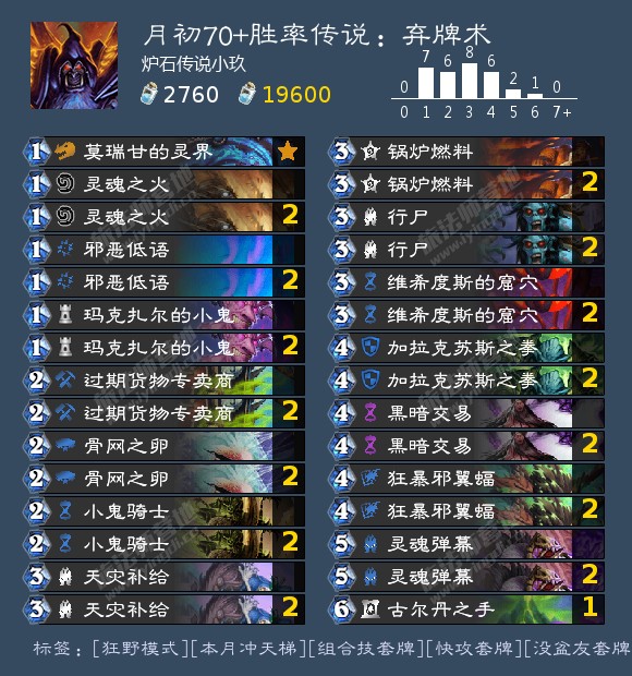 如题,本人月初5号70+胜率钻石10开打上的传说全程用的这套,老玩家都知道弃牌术曾经也辉煌过很多次,虽然削了无数次但是卡组强度依旧有,但是缺点很明显特别吃运气,容易红和破防的千万别玩!还有就是带不了针对和破坏卡,要么就是下不去卡手要么就是被弃掉,所以没必要也不可以带。卡组优点就是优势大部分快攻内战,作为一个快攻展开速度快过牌也快,斩杀线高解场能力强