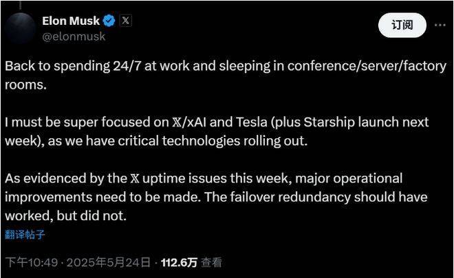 他周六在社交媒体上发帖称,他已经重新回到7x24小时工作的状态,还要“睡在会议室、服务器机房或工厂里”。马斯克表态称:“我必须全神贯注于X/xAI和特斯拉,还有下周的星舰发射,因为我们正推出关键技术。”