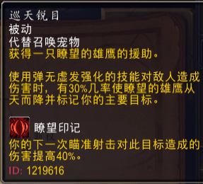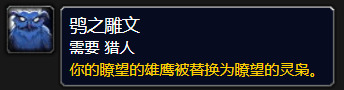 11.1.5版本,暴雪为之新增了雕文效果,可将该技能的雄鹰替换为猫头鹰,但一直未向玩家开放该雕文的获取。