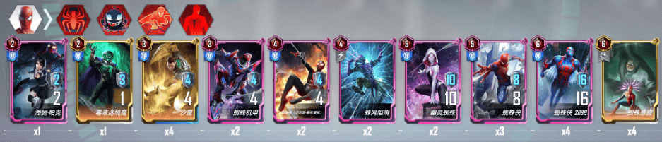 6费:异界蜘蛛侠2099,蜘蛛感应。两张卡组核心,2099有多少带多少。感应城墙组件