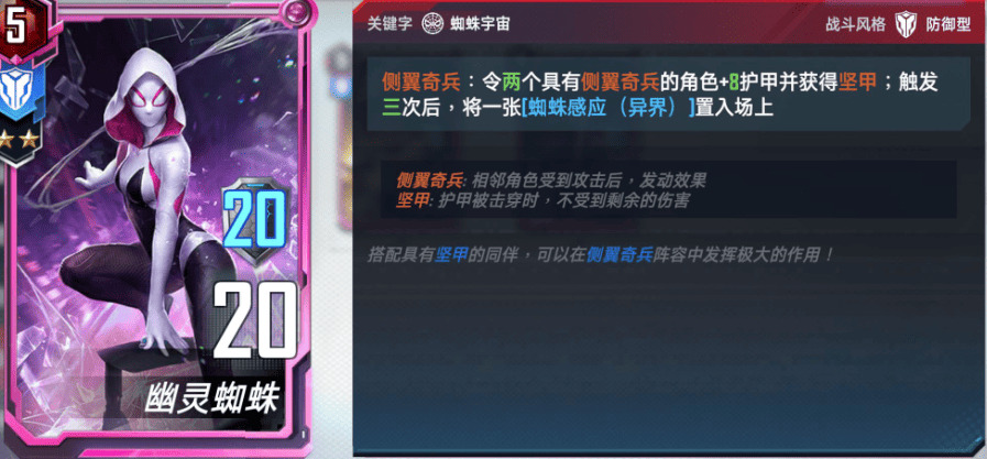异界幽灵蜘蛛:触发侧翼奇兵时,给侧翼奇兵角色提供坚甲,多次触发后额外提供蜘蛛感应(异界)进而保住核心单位。两项防御措施是让沙魔进一步成为城墙的关键组件。