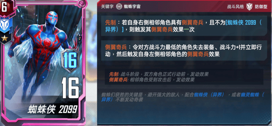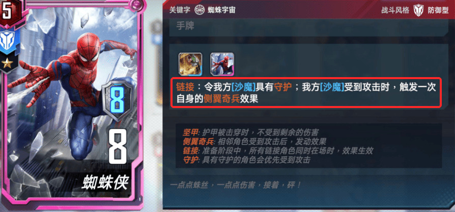 异界蜘蛛侠:核心C位,对方场面上同1单位受(8/7/6)次异界蜘蛛侠的侧翼伤害后会从场地击飞回手牌区。组成链接效果后,给予沙魔守护效果,同时在沙魔受击时触发1次自身的侧翼奇兵效果。很强力的链接效果,借此可以放在沙魔旁额外触发侧翼奇兵,也可以站位更灵活将侧翼效果留给更关键的单卡。