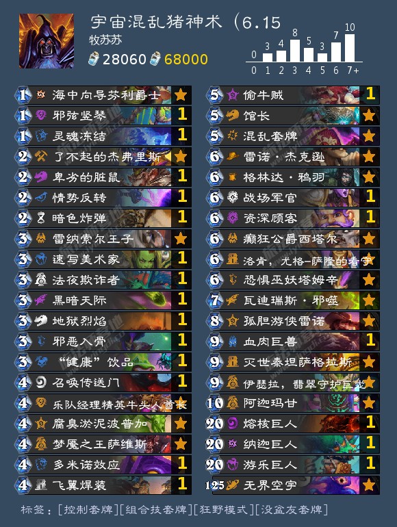 牛里,罪孽交响曲(打慢速必拿,狂乱(或任意解牌,恶魔计划或者火焰祭坛。焚烧,列车难题,多米洛,可换灵魂冻结,意志熔炉,杜加尔,火焰祭坛,赛车回火。环境奇迹贼多换锋鳞,生气气和大哥萨,星界德用多米洛和灵魂冻结,快攻多带列车难题,赛车回火,慢速卡组多带意志熔炉和杜加尔,其他卡不建议更换。构筑思路是只带混乱套牌,暗色炸弹两个暗影法术,速写美术家,法夜欺诈者,暗影炸弹,三卡检索或者芬利,情势反转过牌去找混乱套牌。要点1.关于otk。本套牌携带绿龙,法力值上限为15。除猪神,鸦羽外,偷牛贼,血肉巨兽,召唤传送门,馆长均可配合otk。混乱套牌可为猪神减两费,鸦羽减三费,偷牛贼减两费,血肉巨兽减5费,召唤传送门减4费,馆长减一费;偷牛贼可为猪神减三费,馆长也可检索猪神;血肉巨兽亡语也可检索并召唤出鸦羽,下回合送掉可配合手上的猪神斩杀;猪神鸦羽均混乱可13费otk,召唤传送门减4费,偷牛贼减3费,猪神未混乱加2费,鸦羽未混乱加3费,血肉巨兽可跨回合存费。2.关于巨人。空宇,游乐,娜迦,熔核四巨人,上手也没关系,减费条件均可触发,在牌库内混乱后可0费拍下,配合萨维斯,洛肯,战场军官伺机斩杀。3.关于卡牌配合。黑暗天际,情势反转,芬利,资深顾客的收益跟手牌数量有关,和邪噬,塔姆辛的战吼抽牌效果有很好配合;芋泥啵啵可为黑暗天际,邪恶入骨,健康饮品减费并回血:萨维斯找冲锋巨人有上限,洛肯可检索并召唤嘲讽,两卡都可检索猪神鸦羽otk组件4.注意格子问题,要otk斩杀上一回合别下太多怪,以及泰坦传送门会占格子问题也需要考虑,但是泰坦太优质了,可以当伪终端和优秀解牌,看情况用,活下来最重要。先下鸦羽,再下猪神,后面剩几个格子×10就是斩杀血量,如果打40血要留6格格子。