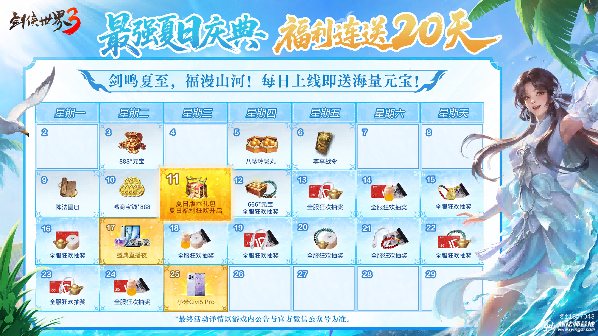 剑鸣夏至,福漫山河!《剑侠世界3》夏日盛典福利季于今日8:00正式公测!“夏日福利版”冰爽来袭,最强夏日庆典开启!游戏内PVP玩法革新,海量福利活动放送,万人超级大服即将开启,全新外观、奇兵上线,豪华礼品连送20天!游戏外公众号丰富好礼等你来,还有在线送万元大奖的夏日盛典直播,更多新版本亮点和福利一次看完,全新夏季狂欢等你来战!