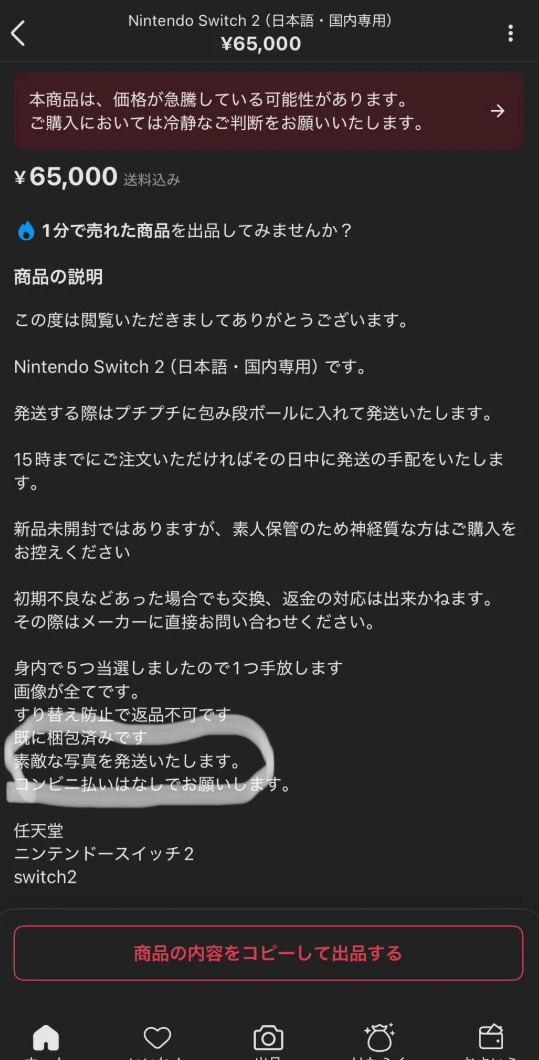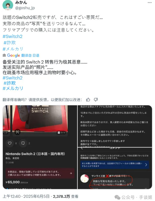 原来,NS2在全球开售了,二手市场上自然开始出现大量转卖的人。日本那边比较常用的二手网站叫煤炉(mercari),而别有用心之人混在网站上发布。