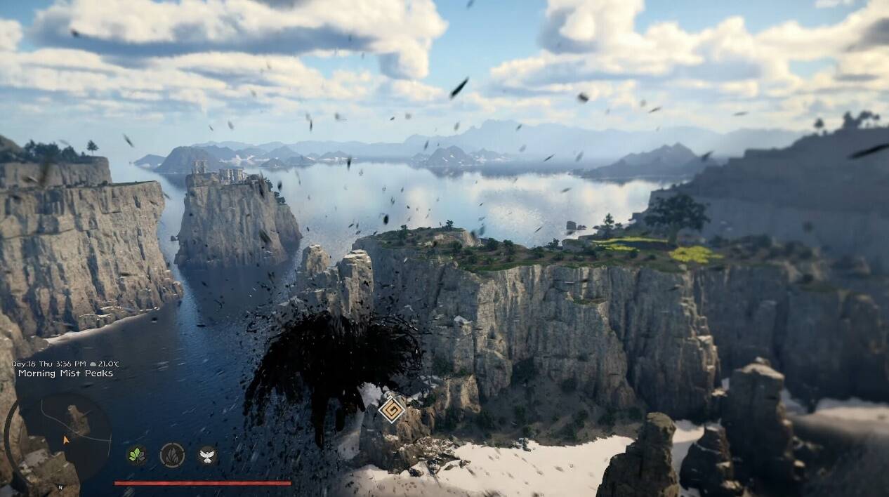 现场同步放出的演示视频中,展示了主角"克里夫"在红色沙漠中策马奔驰、展开"乌鸦之翼"滑翔穿越碧蓝海域等场景,其展现的光线追踪技术与流畅物理引擎引发热烈讨论。