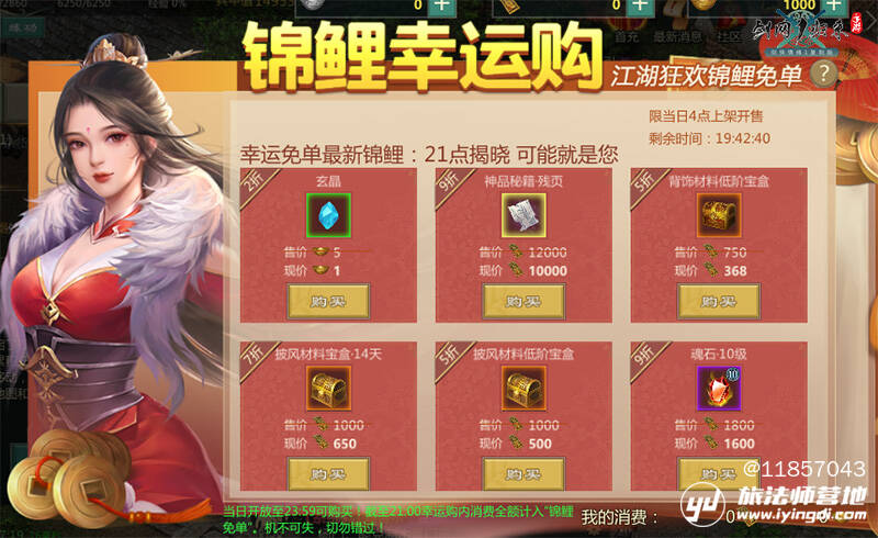 活动期间,年度特惠"锦鲤幸运购"汇聚多种游戏道具特价出售,更有限量套装赠送定制周边。所有参与幸运购的大侠,还可参与6月18日至19日的锦鲤抽奖,每个区服将抽出一位幸运的江湖锦鲤,TA将享受全场消费由官方买单的至尊待遇!