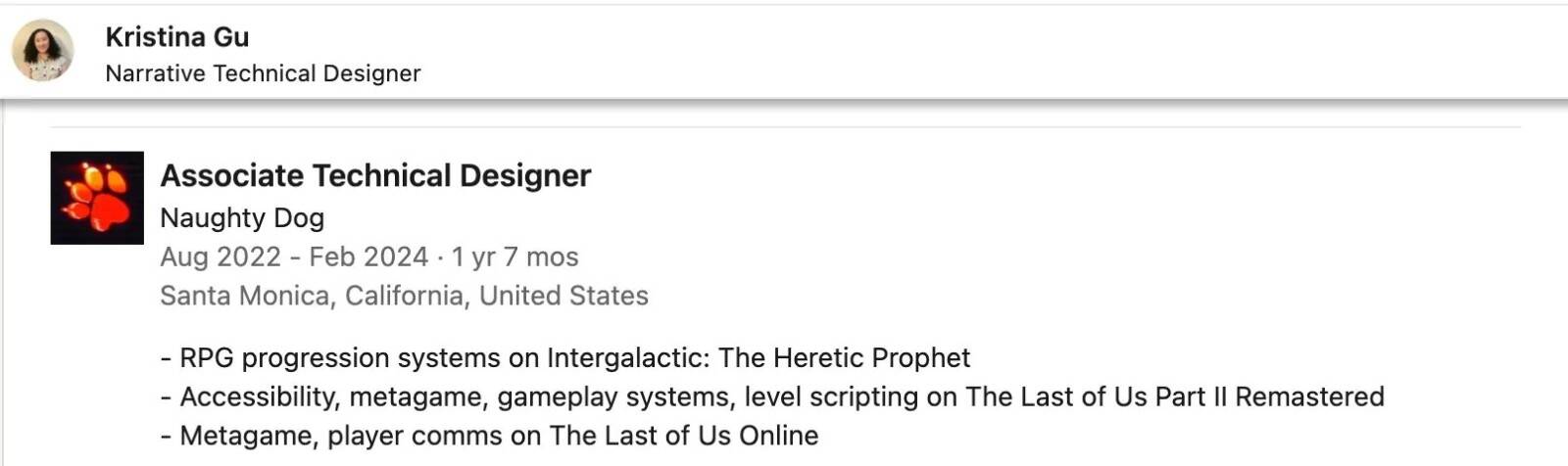 这一信息来自Kristina Gu的领英个人资料,她曾担任顽皮狗的助理技术设计师,参与过《星际:异端先知》的开发工作。