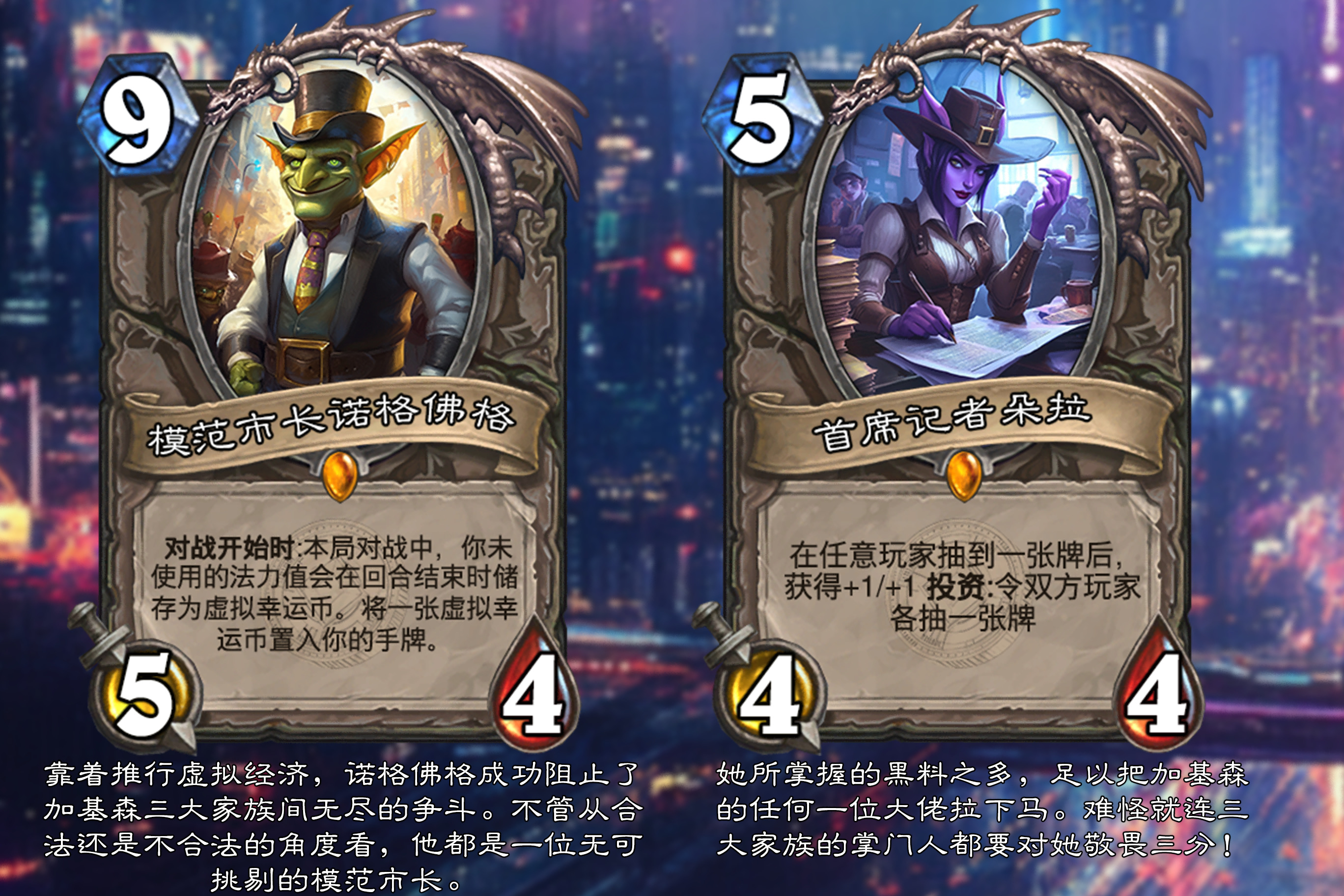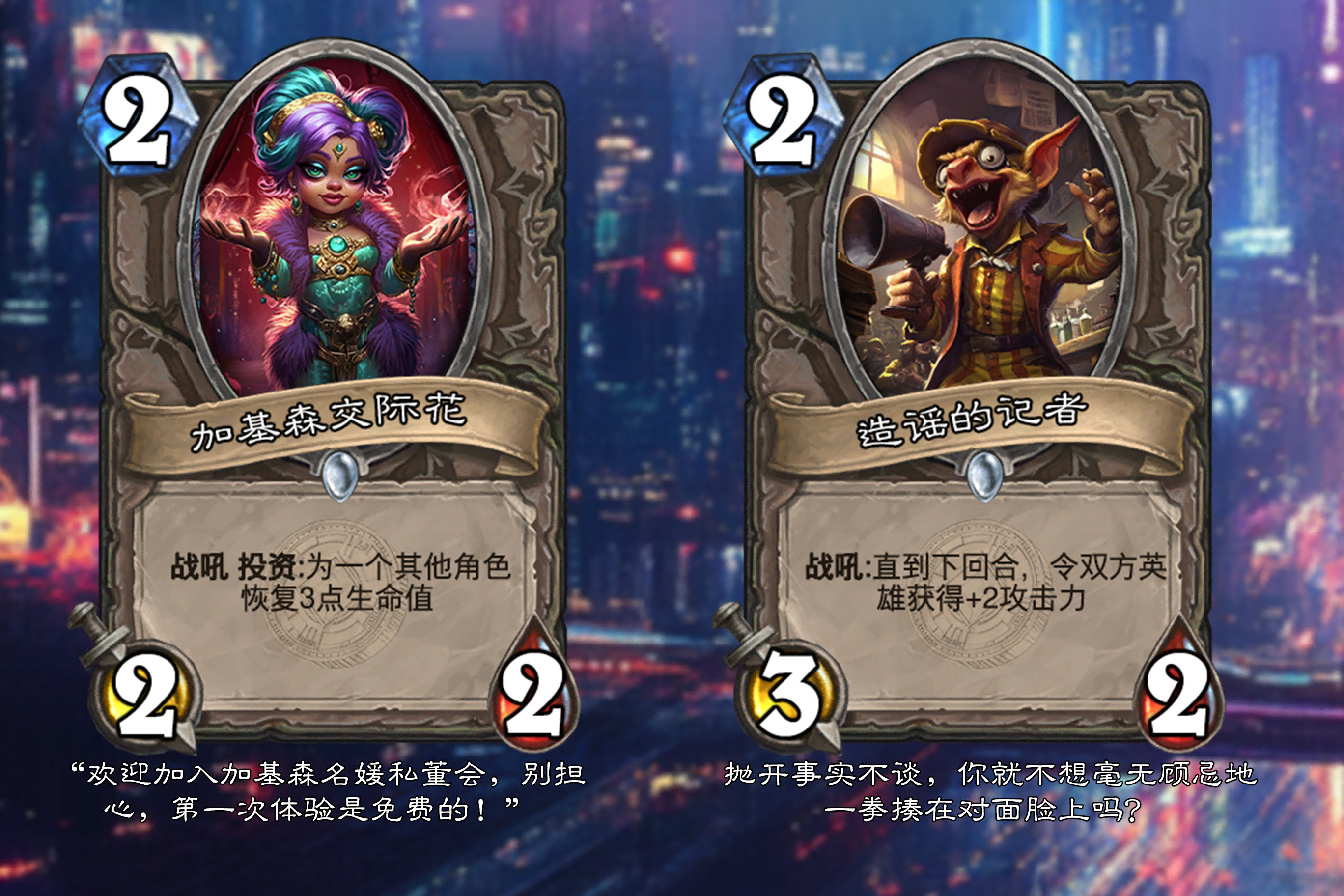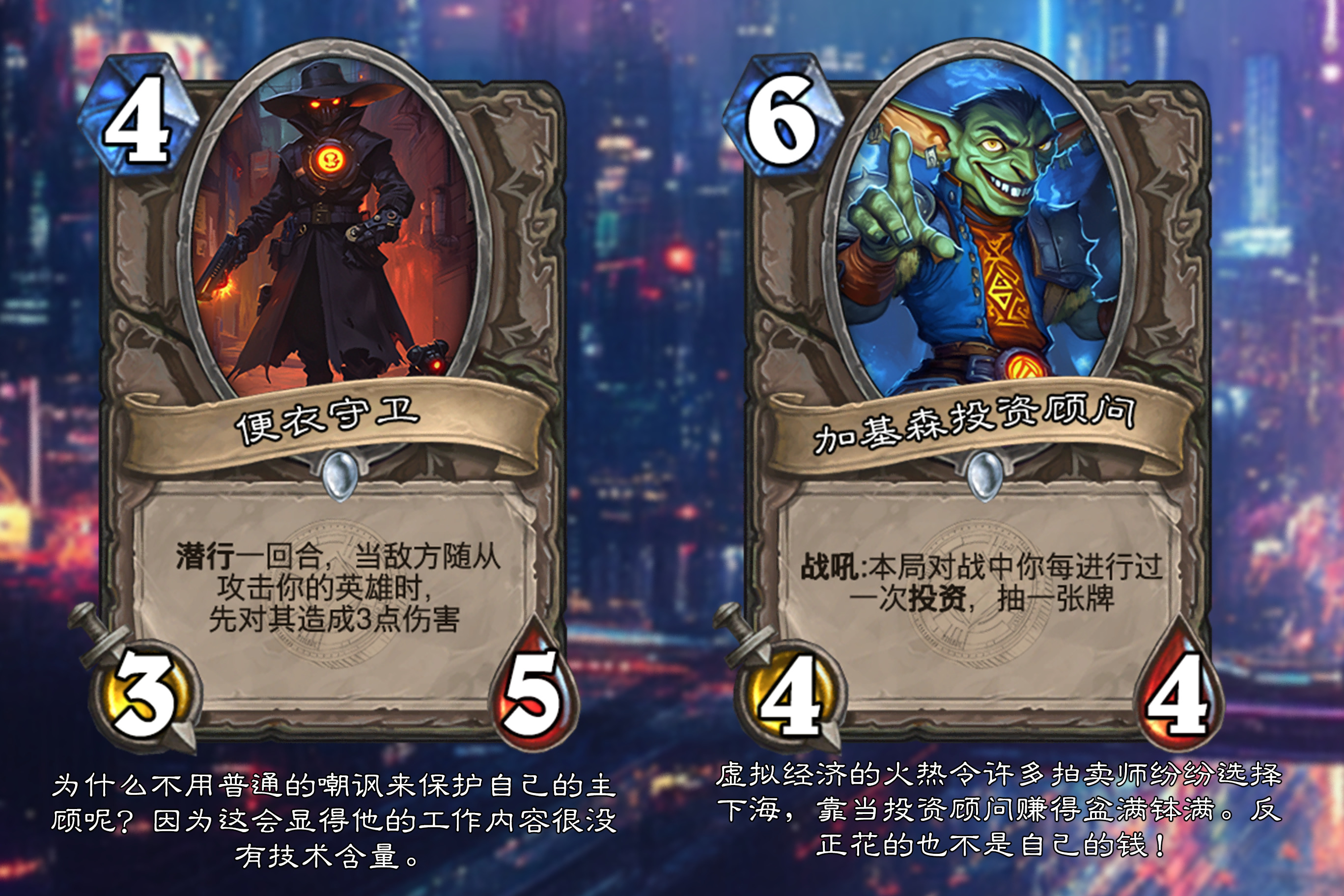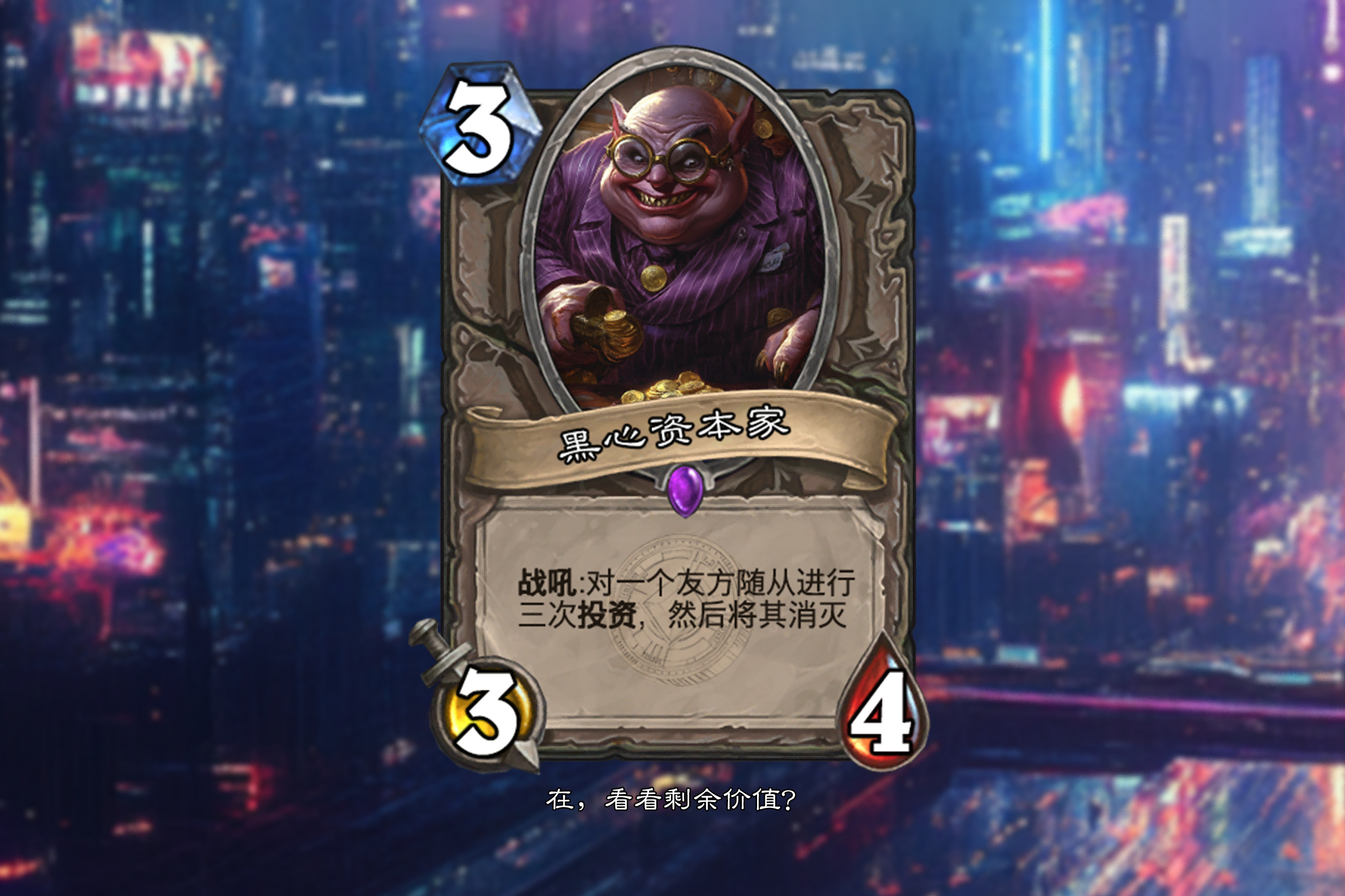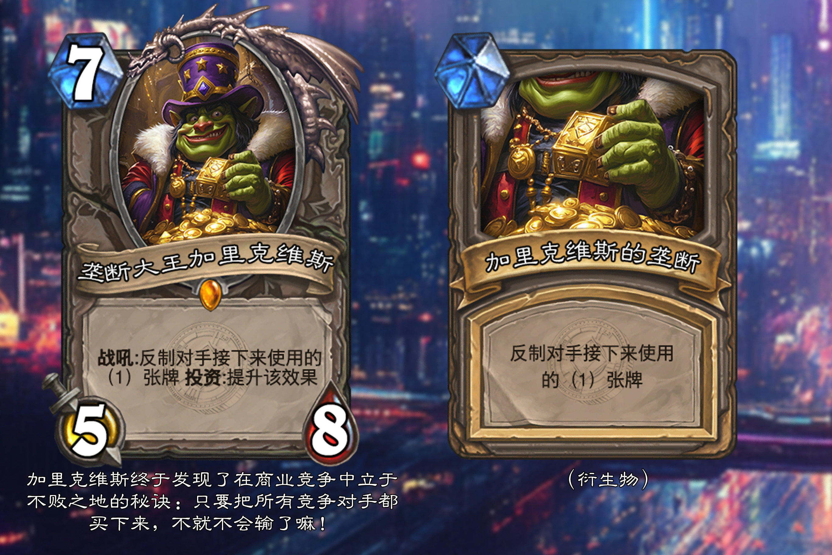 *垄断大王加里克维斯的战吼会生成一个挂在英雄头上的反制光环。投资的效果是增加在这个光环的生效次数。即使加里克维斯离场,这个光环也会继续存在(只要反制次数没用完)。