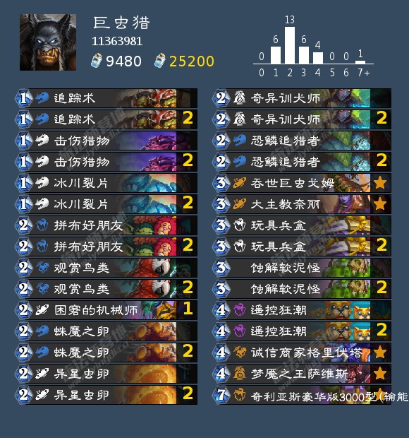 (组这套牌并不是因为我开到了异画巨虫)强度还行,只要两费跳币巨虫或者三费准时巨虫,对手大概率会在五六费面临巨大问题:大部分职业解不掉巨虫要挨两脚24+血,能解掉的也要挨一脚12+血还要解一个大表哥。唯一的问题还是亡语站场不够用,配合太少,劳作老马是亡语站场但是喂虫子就很蠢了。发现体系也试过了,斩杀更高但是速度慢,很容易抢不到节奏,除了打乌龟卡组和星灵法之外没有其他优势,但是打乌龟卡组有更优解星舰猎,其他卡组显然更忌惮前期站场接4费散装大表哥而不是两头带甲粉皮猪。