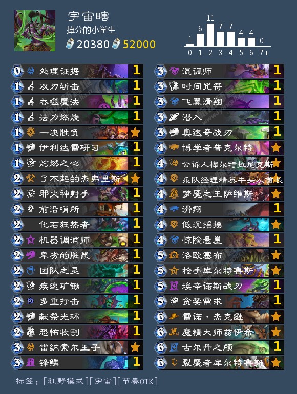 从狂野1w开打直上4900这套牌打法和宇宙猎相似 主打前期节奏 卡组带上了426锁手牌 锁晶 还有经典的法力燃烧和滑翔 各种搞人小组件 在面对德鲁伊和元气骑时 挺搞对面心态的因为这套牌费用最高也就6费 锁晶对我们来说是优势 博学者最好5费打 这样6费抽的头颅可以直接打出不会卡流放 排序后头颅抽到锁金加洛欧塞布给到的压力挺大的终端核心:ak技能瞎子的蛋刀和低沉摇摆是一个很经典的终端 算是一个伪OTK 前期蹭些血 在蛋刀满耐久的情况下 低沉摇摆过后可以踢4下 几十血的斩杀线是很高的牛牛的伊格诺斯配合吸血刀加双重打击 也是一个备用的终端手段 两刀高攻的吸血也可以打出很高的斩杀