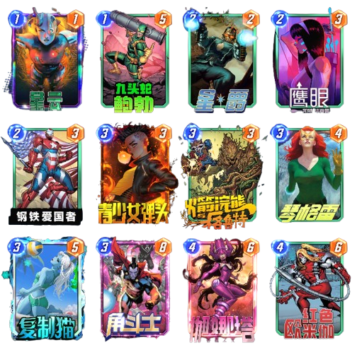 毕竟这是一个拼战力的游戏,在有琴的干扰下依然会因为战力不足而输掉对局,那么这套的战力担当我选择了这四张卡,他们都是同费用中的佼佼者,其中星爵和角斗士的不稳定性也会被琴的效果而抵消,其中鲍勃的移动效果也可打出意想不到的效果。