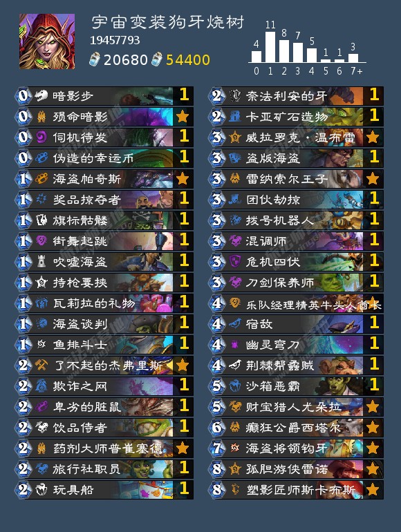 看战绩,还是能赢不少对局的。改来改去,发现之前没用过但意外好用的两张卡。1小狐狸。我一直以为比较慢前面没带,带了后发现还是很强的,可以当个小核心。剽牌很足。基本不会出现卡任务的情况。比钩牙好达成。2饮品海盗。海盗属性,饮品虽然随机但都能用。打骑士大人可追梦套盾。打快攻有好几瓶都很强。相当于剽三次,养刀触发小狐狸一流。3混调。人称界卡扎,没有宇宙词条,但有宇宙质量。弥补盗贼最缺的aoe。比刀扇好用多了,能腾格尔。狗牙,姐夫,狐狸,刀,罗。这五个是核心。狗牙后期最强,但打快没用,其他几个打快打慢都好用。刀我只带了一个保养师和一个礼物。牛里有张嘻哈。理论最高攻击是先保养师养到3攻,然后礼物加2,嘻哈加3,复制法术传说再加3,可以到11攻。实际上玩的时候三四五攻居多。一般就是保养师养一下,给个礼物,就是一把吸血海绵斧,伤害完全够用了。试过以刀为核心的构筑,不行,打快卡一堆没用的刀油,打慢一个姐夫就无了。所以现在就带一张最灵活的礼物,打慢拿个毒药,打快还能拿刀扇背刺。养个四五攻既有一定威胁,吃姐夫也不心疼。铜须,腾武都不带了。配合卡容易卡手,只玩单卡质量。剑圣也不带了,前面星界德多才带的。因为有刀,不带雷诺奇利亚斯回血了。
