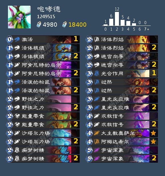 靠小随从铺场然后打出过火和野性之力和宇宙混响做大场面,经常四五费就让对面看不懂场面了,能铺个4-5波,对面一般最多解两次就撑不住了,而且大主教还经常能有讲故事的机会,现在环境的圣骑士和法师都很慢,前期很容易打出对面看不懂的场面,不过不好打牧师和自伤瞎,今晚钻三开打,打了个12-2的战绩,只输了两局,强烈推荐主流卡组玩腻了的大伙试一试