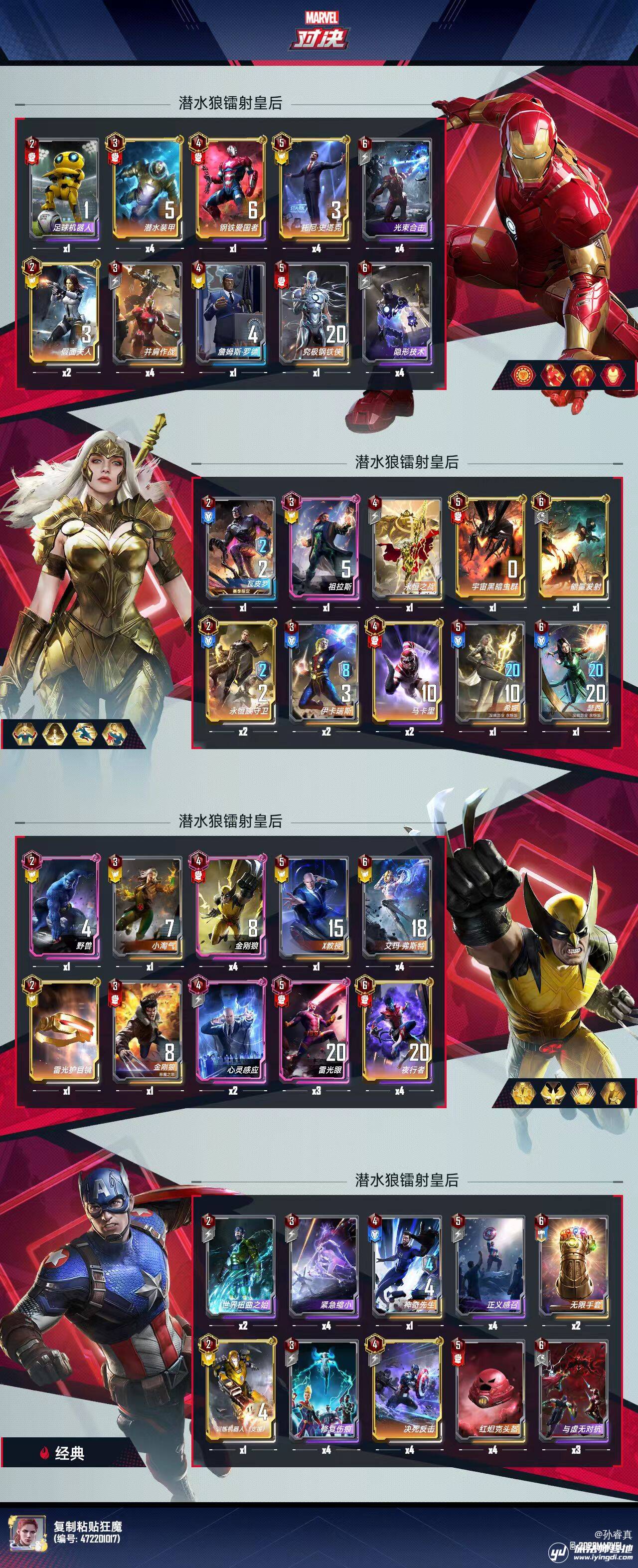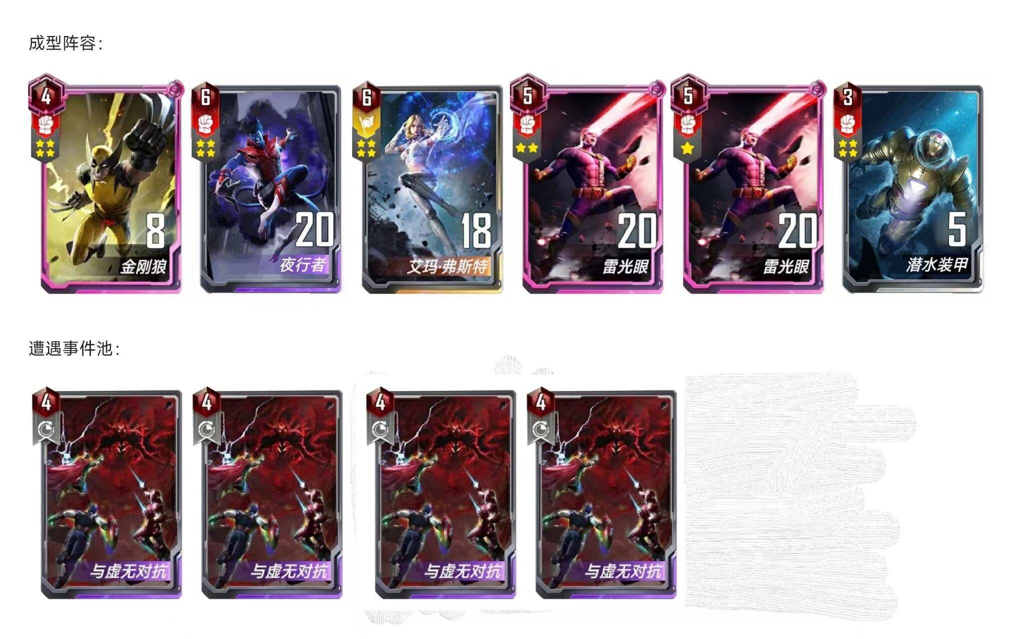 七回合及以后:血量健康则升六感应三狼凑齐阵容,否则可停在五本找托尼补充经济,找X教授以便一次异界心灵感应获得大量X战警,找异界镭射眼以多次触发爆发技能配合潜水装甲buff全队(几乎全队),但是最多停一回合,升六本还是需要尽快,没有白皇后无法高频触发觉醒,buff能力会低很多