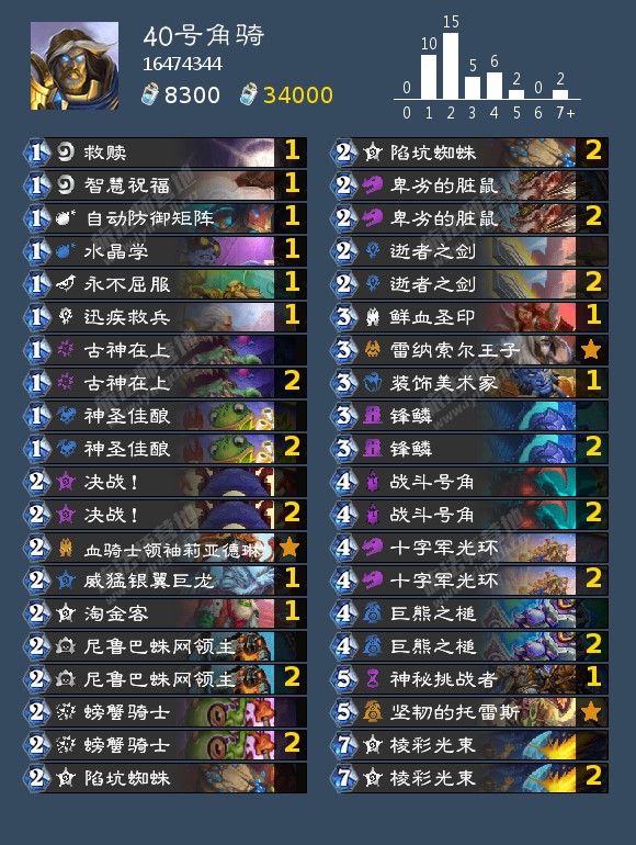 45把60多胜率,老卡组也没什么好说的,从驴子网抄的构筑,带回了神秘挑战者和一张城建税。我环境里任务瞎比较多,把城建税换成了另一张锋鳞。