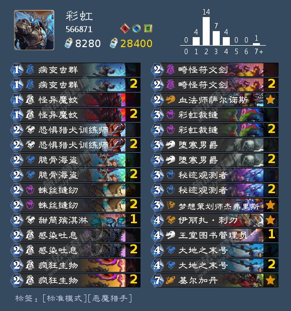如上文,月初快攻横行彩虹裁缝快攻内战yyds,卡组唯一建议改动的就是鸡蛋换成第二张沉默,天湖开局即一费虫群接2费刀爽的飞起,起手有训练师可以留脆骨,否则不留,不建议带海绵刀和第二张冰淇淋,残骸会不够用。另外,宁愿3费空场转技能也不要空场下322观测者,一定要场上有2-3个随从再下,主打一个干扰解牌,前期裸下太亏了