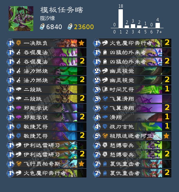 任务瞎的最终任务奖励并不重要,但是他的阶段任务奖励可太厉害了,过的牌都能减一费,也就是说,先过三张,然后再过三张就是6张可以减6张牌的费用,还是1费挂上的,要知道术士那个过牌减费的武器可是5费啊,阶段任务奖励很超模,但问题是怎么过上这么多牌呢,这里面的大过牌只有两个一个是时间咒符,一个是飞翼滑翔