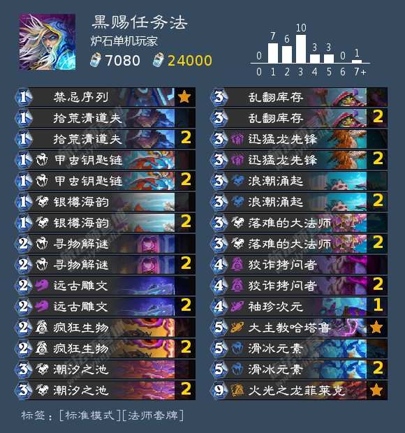试了一早上任务法,不出意外被洛德和鱼人骑暴打。但是经过实战,发现黑赐牌和法师任务的相性很高,个人认为补丁后走随从流的法能在补丁后有所发挥,甚至超过纯法术体系的任务法。 经过尝试,法术体系的任务法存在几个大缺陷,第一点是随机性过于大,本身法术法的匣子随机性已经很大,加入发现体系后更是大的离谱,经过实战,法师的发现池如果不加限定,比如雕纹和地标这种,非常杂乱,提刀后伤害牌都是乱砸,很难打出稳定的收益。比较稳定的就只有发现奥秘,但是收益不大,列王收益大,但是进攻性不强,且不能做到稳定的解场或进攻。第二点发现体系有点太臃肿,手牌根本卸不掉,前面讲到随机性,袖珍次元这张牌好的时候能一卡做完任务,差的时候只有两卡,又加重了这点。但是纯法的发现卡又少,不带任务做的可能又慢。最后一点场面较弱,哪怕是做完任务后,能稳定产生场面的卡只有找不同的一地三费,可以说根本不够看,此外就只能祈祷列王宝藏有星云了。 随从体系的任务法上限要低不少,但是胜在扎实稳定,做任务的牌要多,收益也更大更稳定。其中尤其是黑赐体系,所有的中立黑赐都是发现,既能做任务,又能在提刀后让优质的黑赐随从站场,相性极佳。